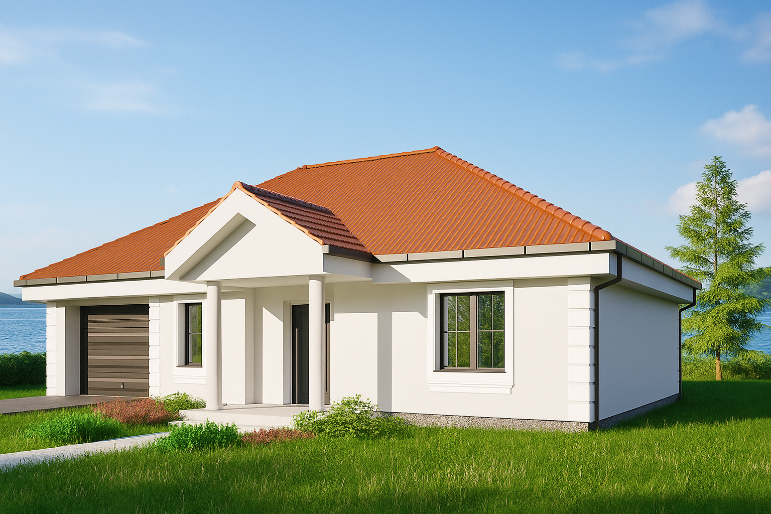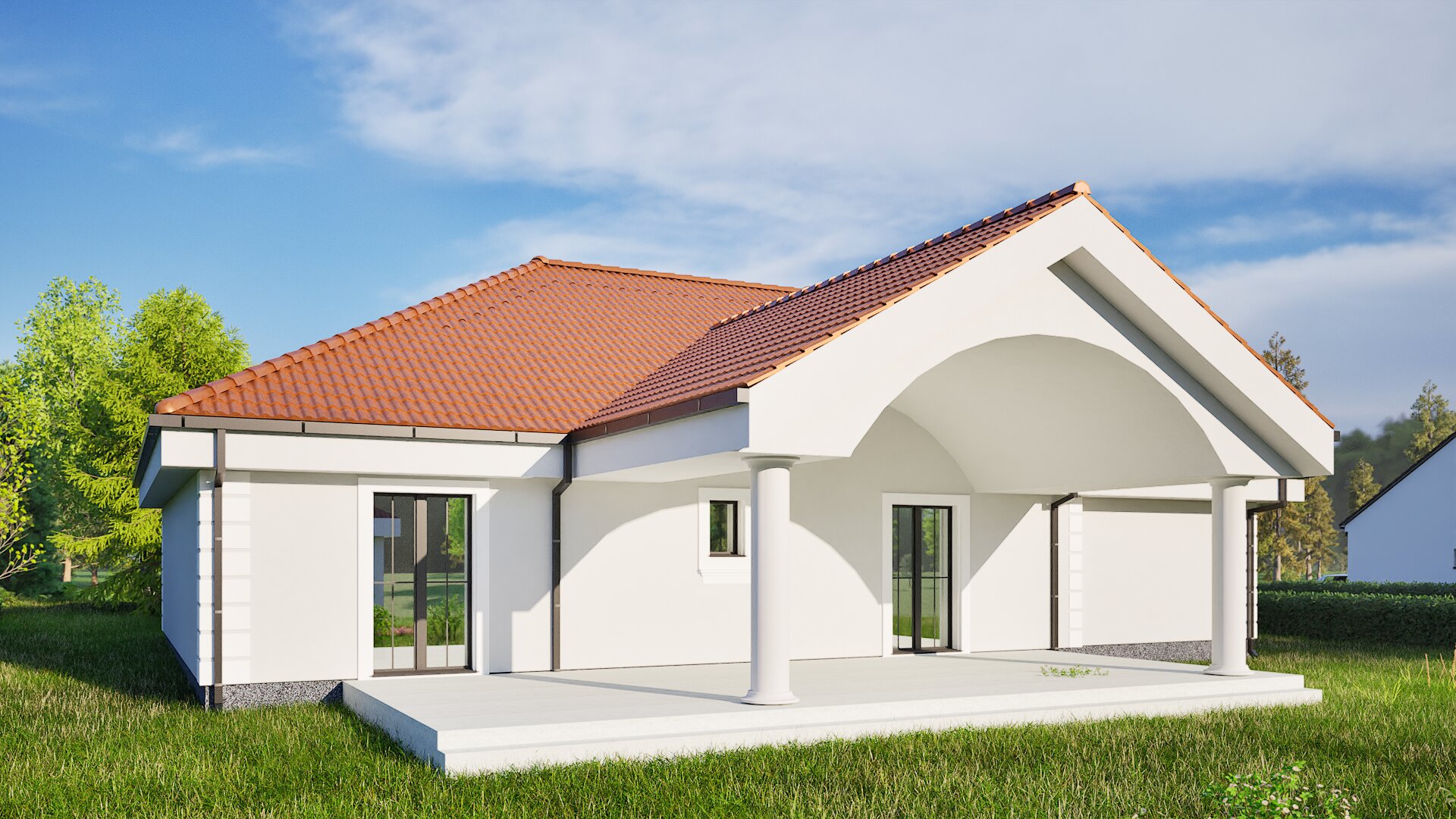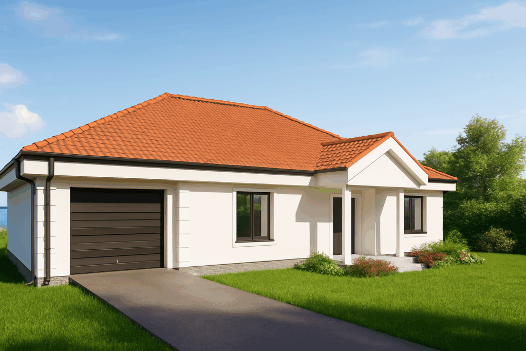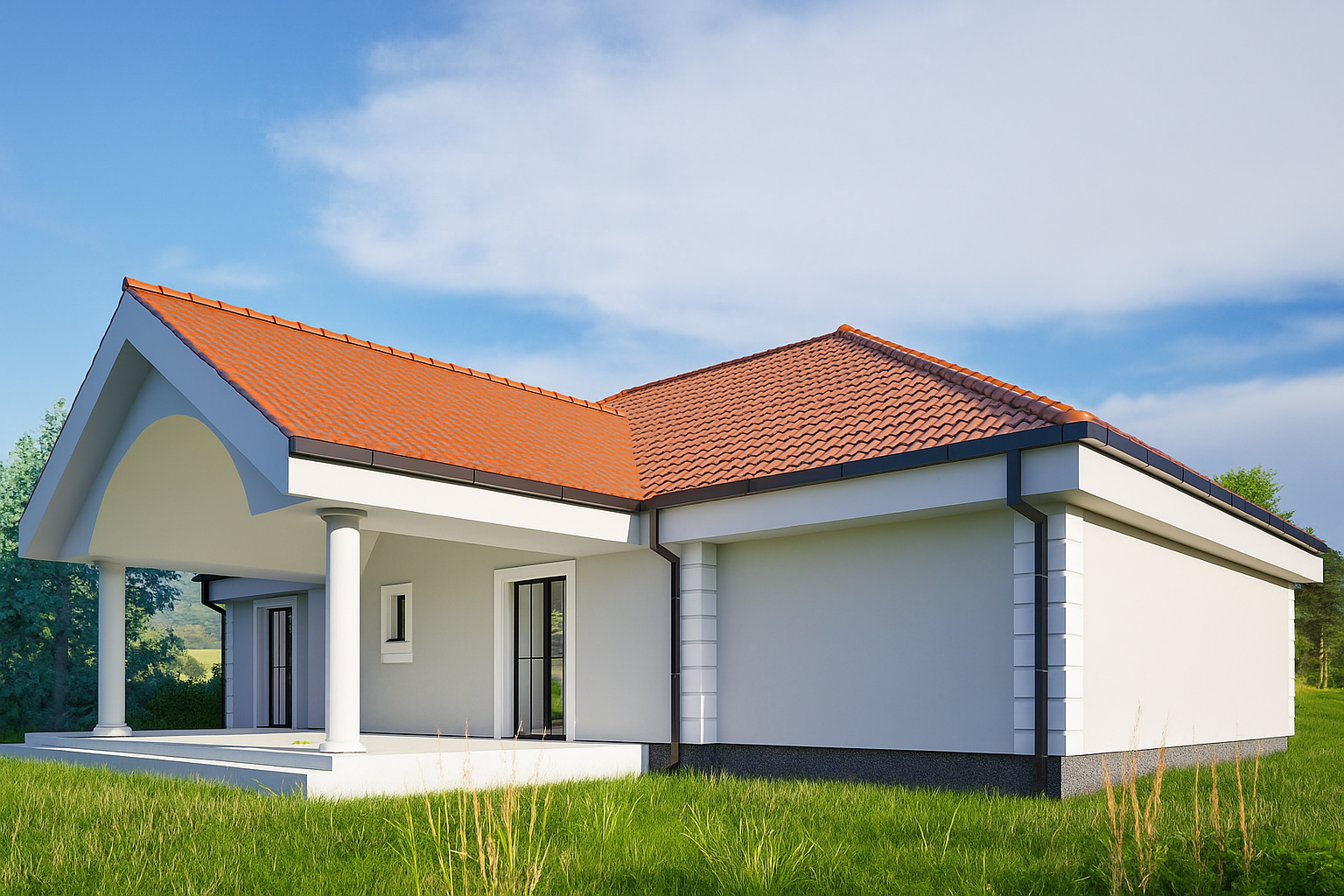 The dominant terracotta hipped roof shelters bright, rendered façades that are rhythmically articulated by belt cornices and corner pilasters. Anthracite‑coloured aluminium joinery adds a crisp modern contrast.