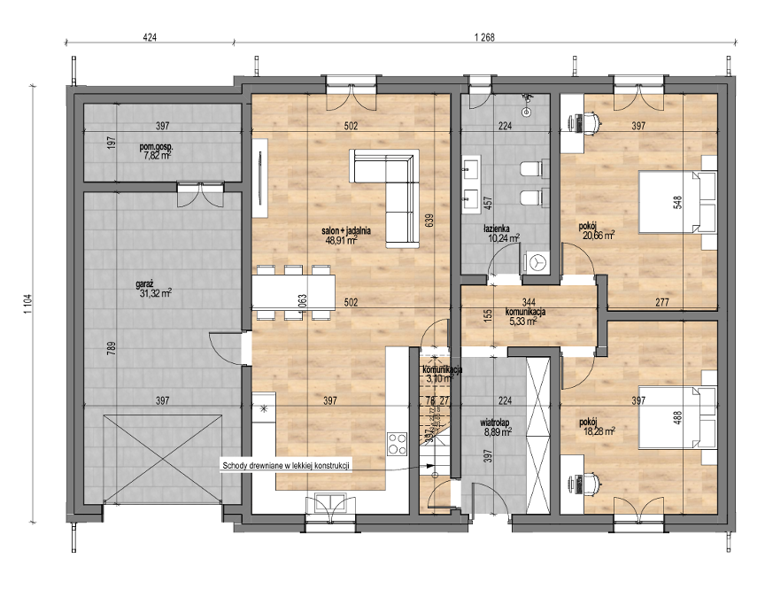 A generous vestibule connects directly to the open living–dining area and gives internal access to the garage. A compact technical room behind the garage houses the heat‑pump, hot‑water cylinder and HRV unit, while the attic is reserved for storage only.