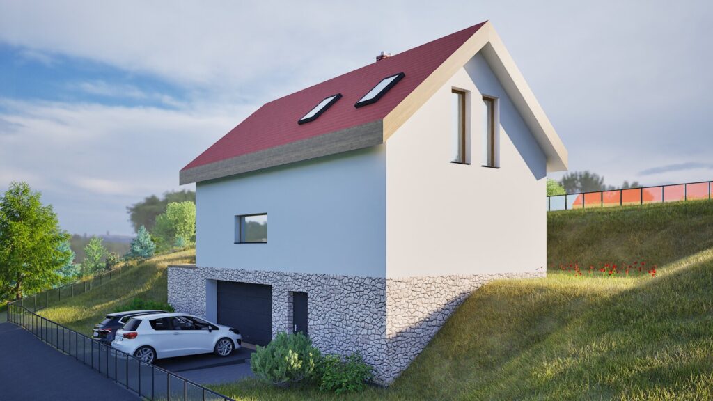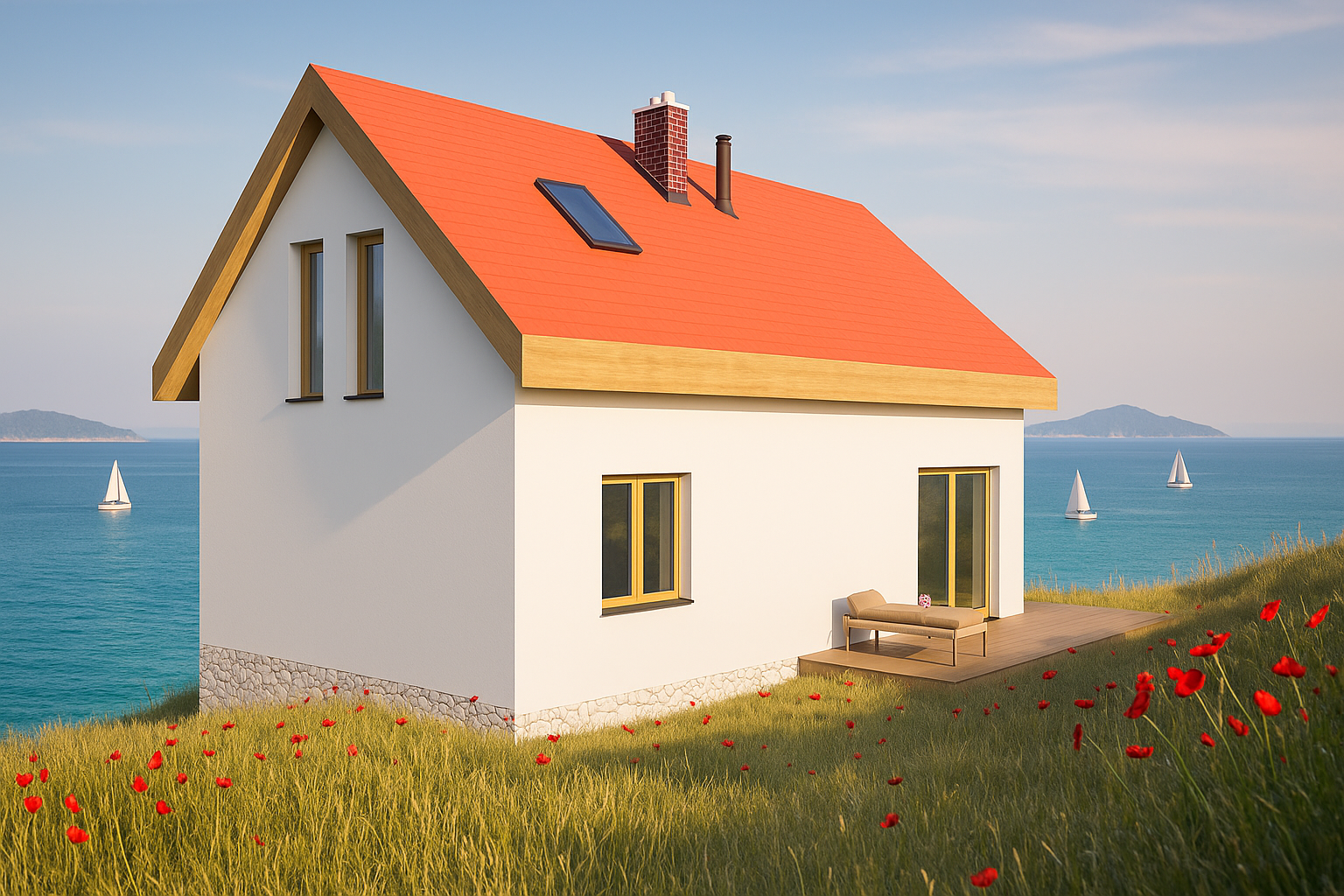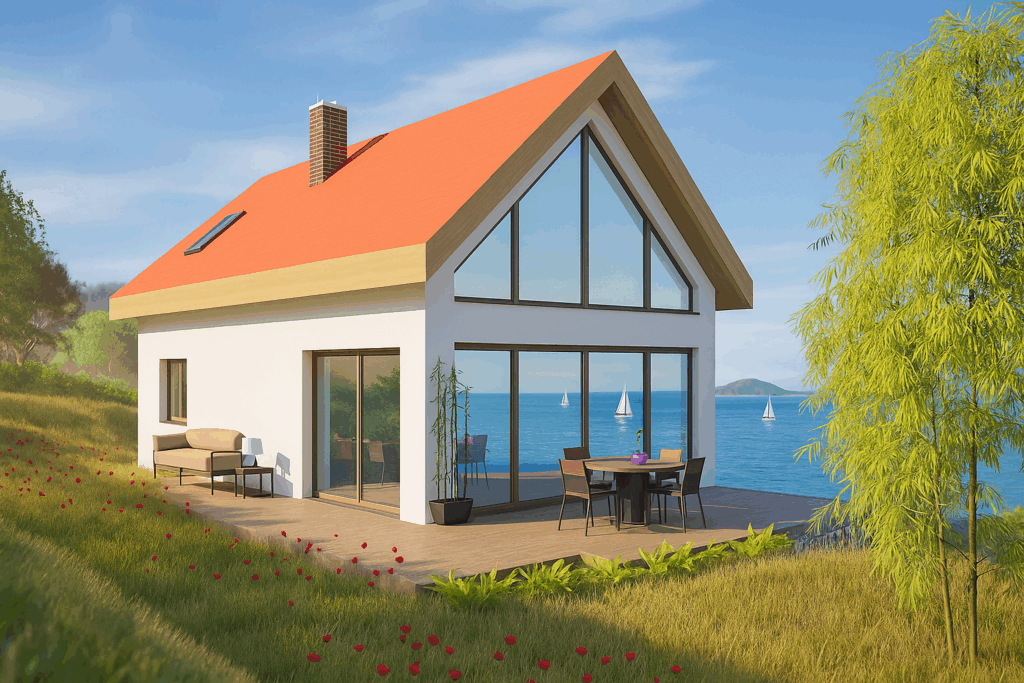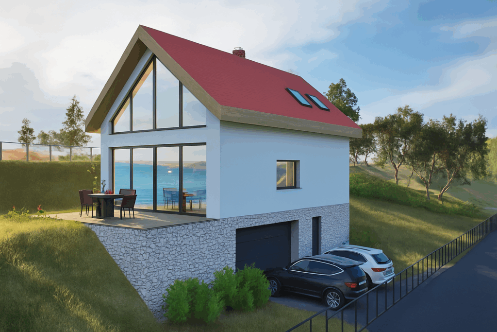 Perched on a wildflower‑dotted slope above the sea, this two‑storey chalet pairs a vivid terracotta roof with clean white render and a natural stone plinth that anchors the building into the hillside. A soaring glazed gable captures sweeping water views and floods the interior with light, while sliding doors open onto a wrap‑around timber deck for easy indoor‑outdoor living. The lower level houses an integrated double garage, and roof windows draw sunlight into the loft. Compact, energy‑efficient and full of character, this home offers a modern take on the classic coastal cottage.