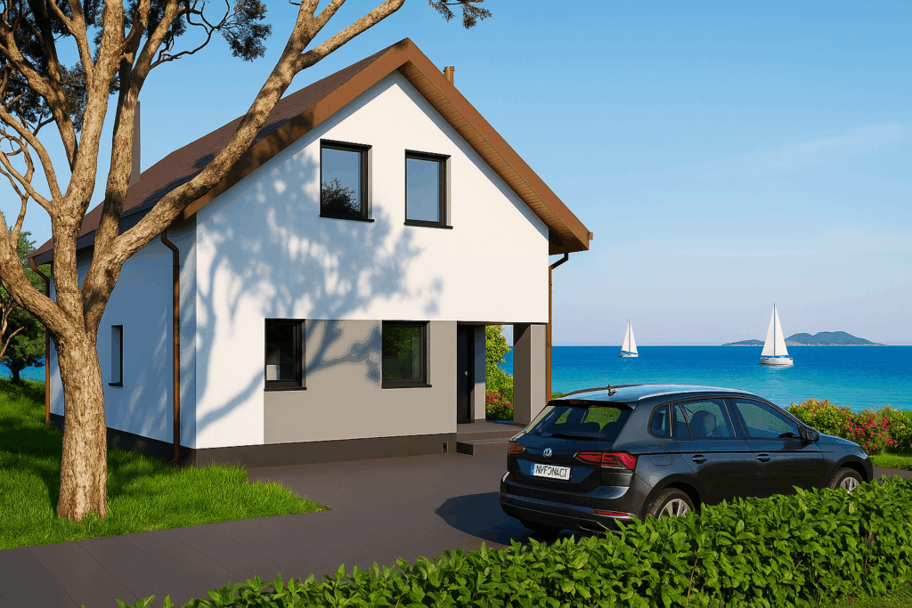 Blending crisp contemporary lines with rustic timber detailing, this gable‑roof chalet delivers cosy alpine character right beside the sea. Floor‑to‑ceiling glazing and sliding doors link the open‑plan living space to a generous hardwood deck and an upstairs balcony—perfect for indoor‑outdoor dining in every season. Above, twin doors open to a timber‑railed terrace overlooking the garden, while the ground floor flows effortlessly to level lawn ready for a future pool or play area. High‑performance insulation, skylights and a chimney flue provide year‑round natural light and energy‑efficient comfort with minimal running costs. With on‑site parking and a turn‑key finish, this charming retreat is equally suited as a family getaway or high‑yield holiday rental.