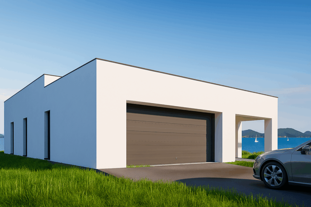 Sculpted in crisp white and charcoal, this minimalist flat‑roof villa offers pure modern geometry set against endless blue sea horizons.