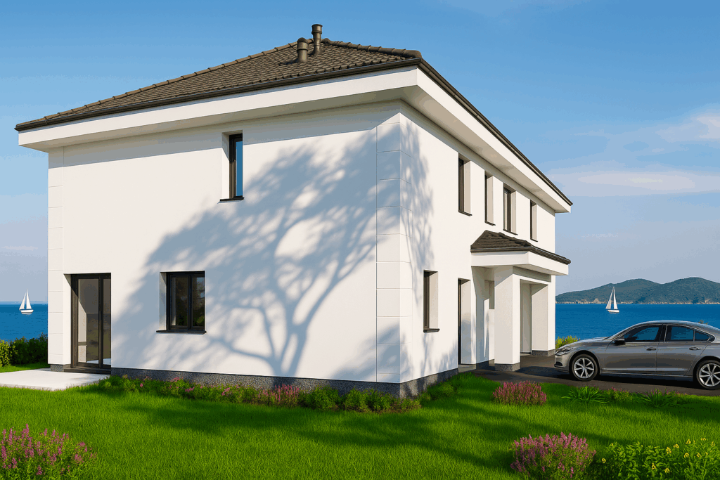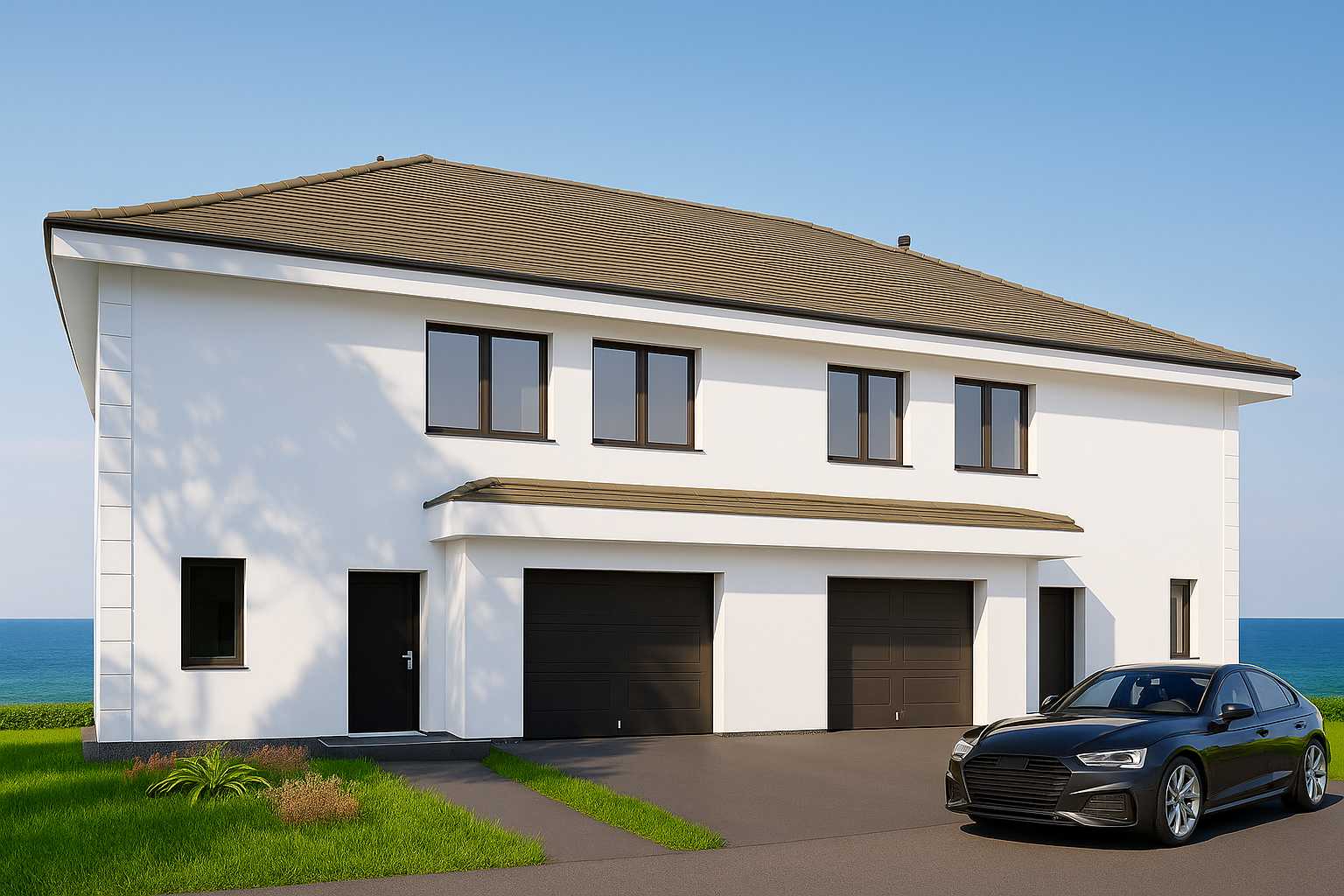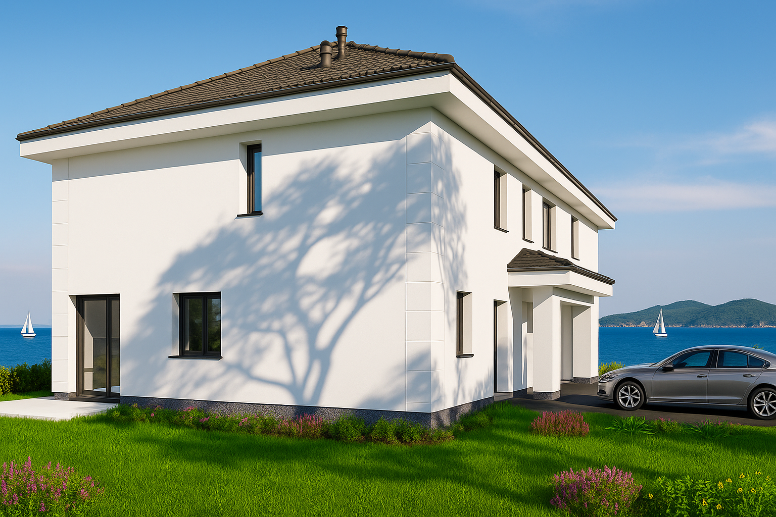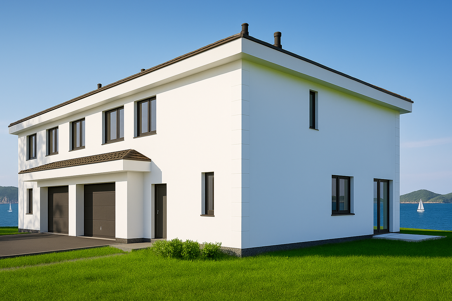 Commanding clean modern lines and a sweeping sea backdrop, this two‑storey villa pairs crisp white render with anthracite accents for instant curb appeal.