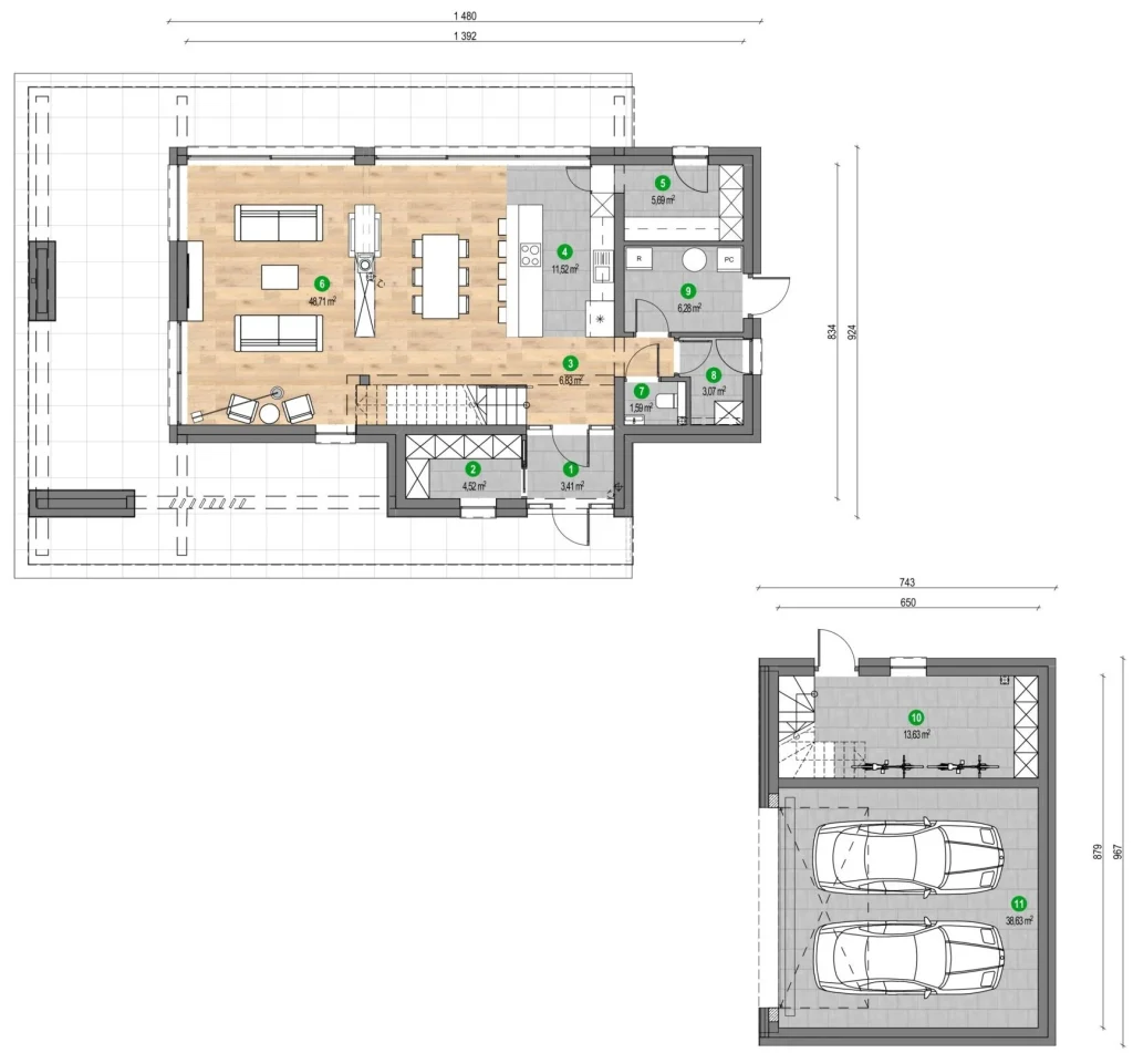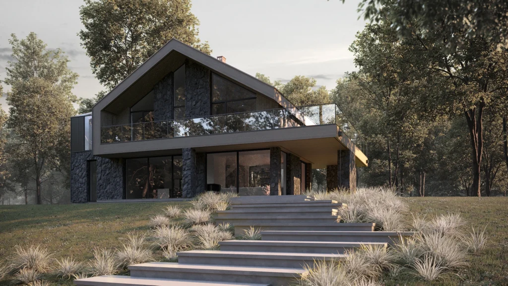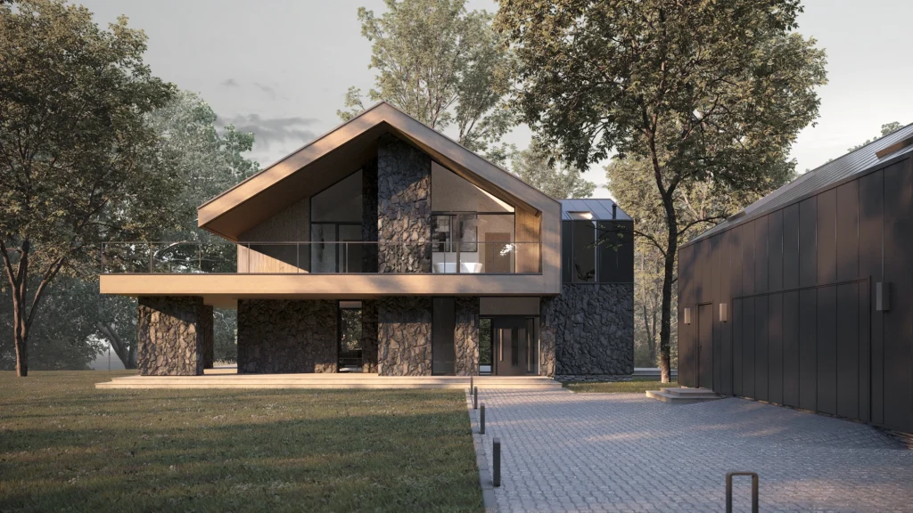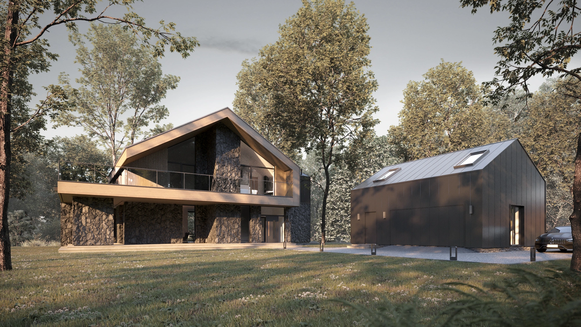 The project will interest those who prefer modern combinations with a touch of classic. The building combines the functionality of the first floor with a charming attic, and what draws special attention are the large glass walls in the living room, creating an almost cinematic screen on the panorama of the surrounding landscape. Right next door is a designer barn in a deep shade of black, emphasizing the unique character of the place.