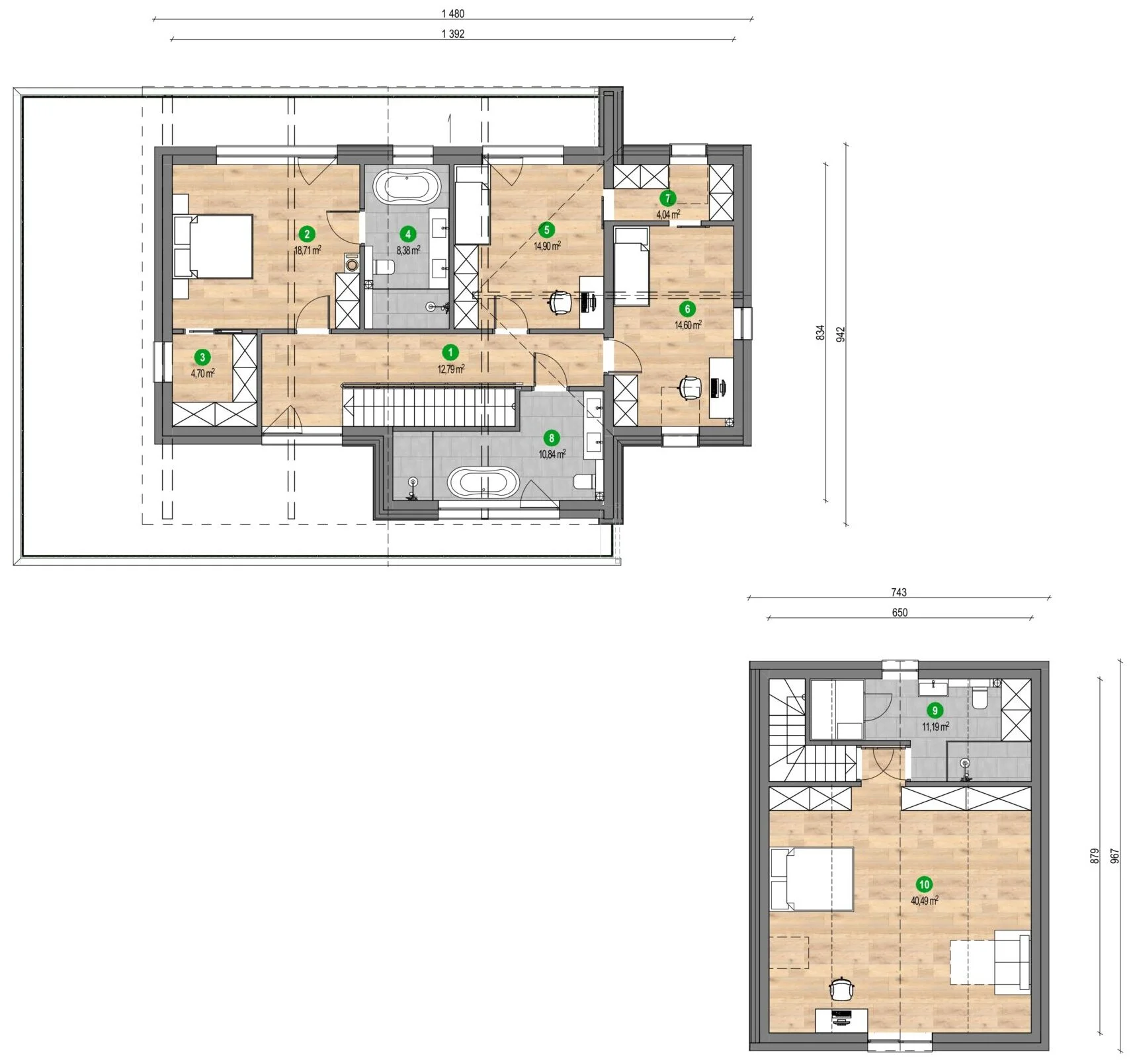 The wooden facade, alluding to ecology and nature, perfectly contrasts with the surroundings, while the gabled roofs complete the whole, creating an elegant and cohesive image.