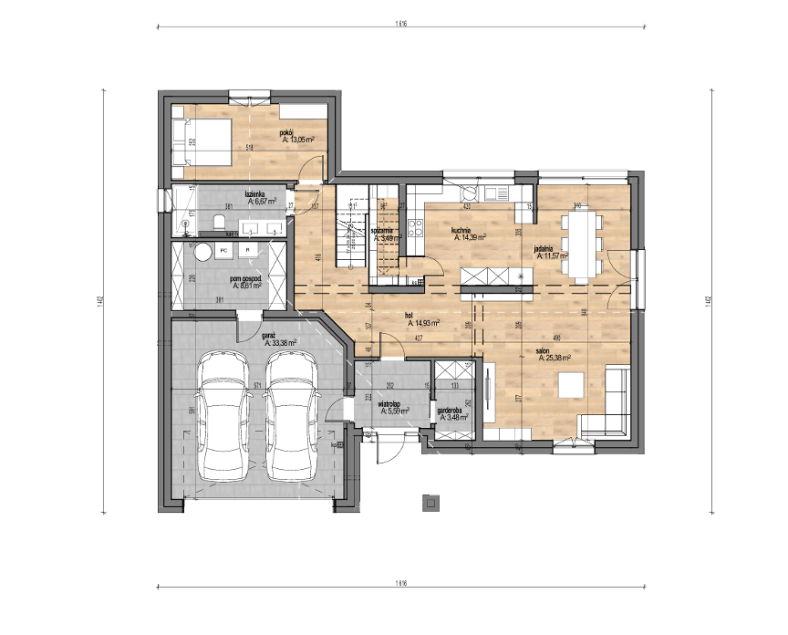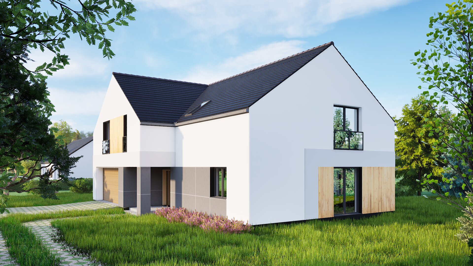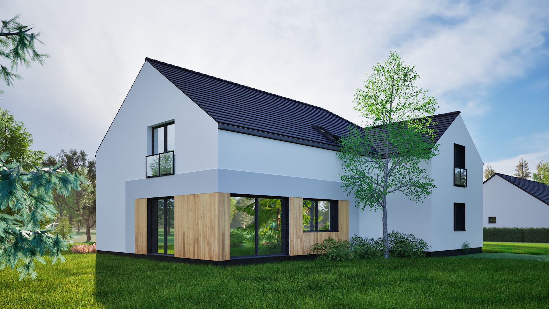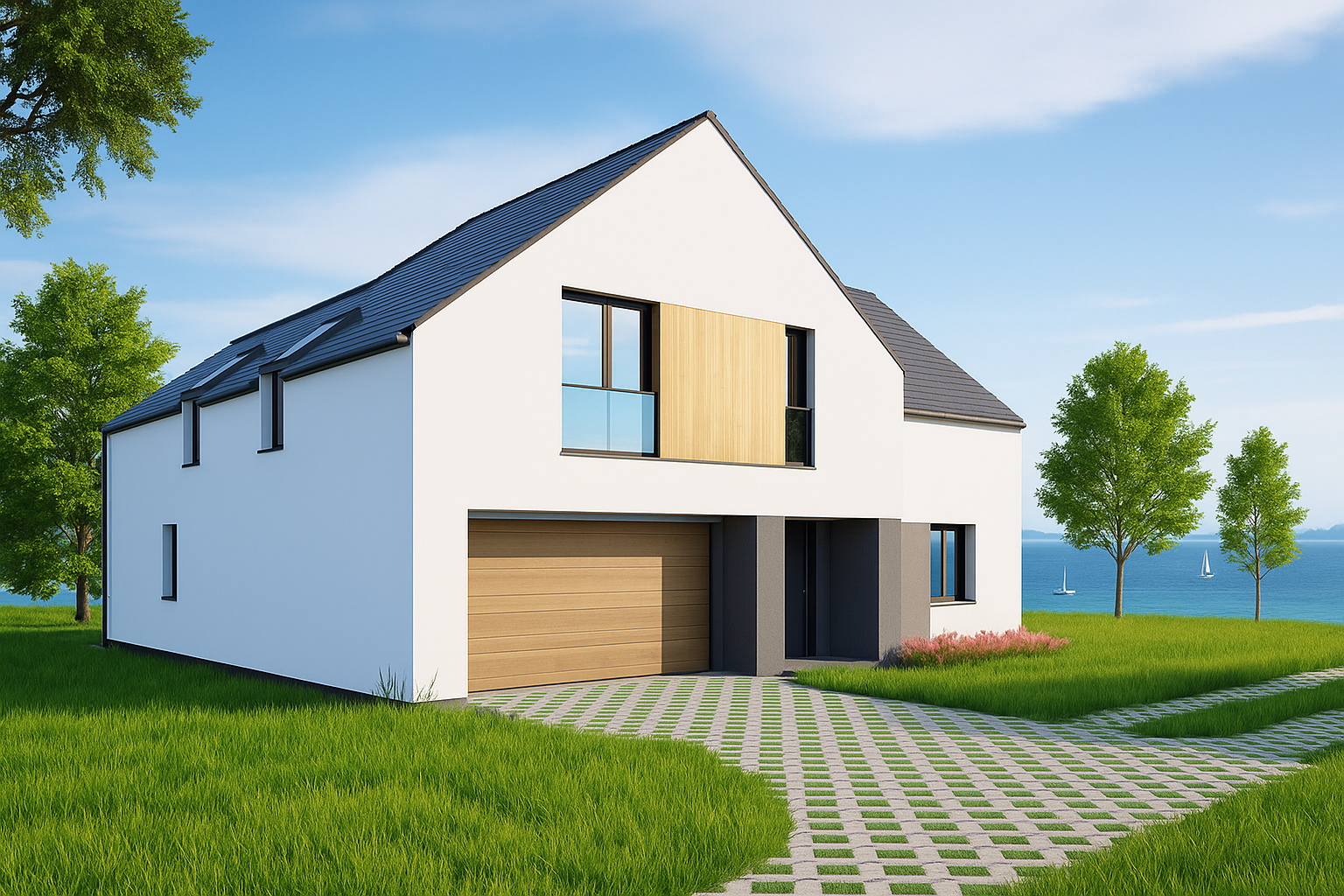 Ova suvremena dvoetažna rezidencija ponovno zamišlja klasičnu siluetu staje s oštrom bijelom žbukom, strmim krovom od tamnog crijepa i toplim drvenim detaljima. Dvostruki dvoslivni volumeni povezani su svjetlom ispunjenim ulaznim hodnikom, dok ostakljenje u punoj visini i stakleni Juliet balkoni uokviruju panoramski pogled na more i vrt. Klizna vrata otvaraju se iz dnevnog boravka otvorenog plana na uređene travnjake, a integrirana dvostruka garaža diskretno je postavljena ispod drvene ploče na gornjoj razini. Energetski učinkovita gradnja, minimalističke linije i prirodni materijali stvaraju sofisticirano, ali gostoljubivo utočište na obali.