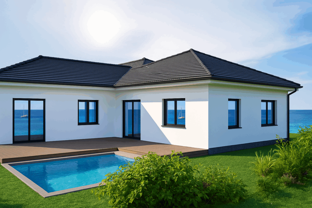 Živite životni stil odmarališta svaki dan u ovoj elegantnoj vili u obliku slova L, gdje se s oštrim bijelim žbukom i krovnim okvirom od drvenog ugljena pruža panoramski pogled na plavu vodu.