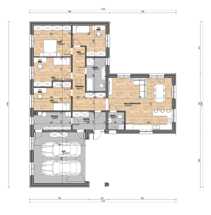 • Dnevni boravak + Blagovaonica + Kuhinja: 41,66 m²