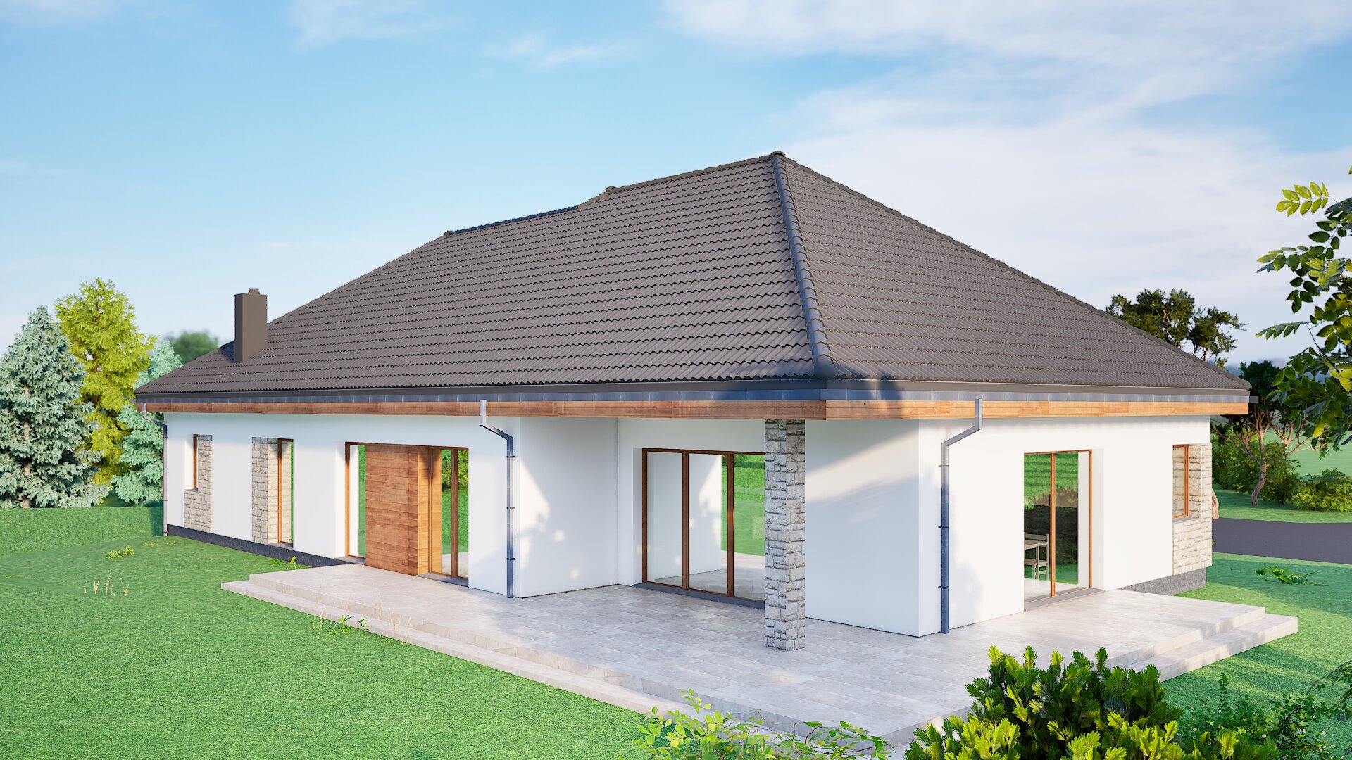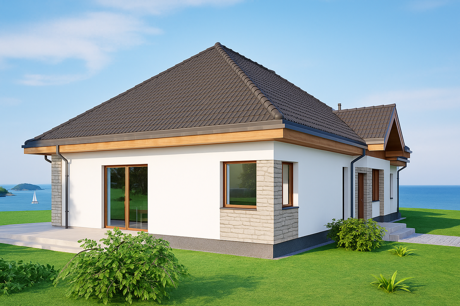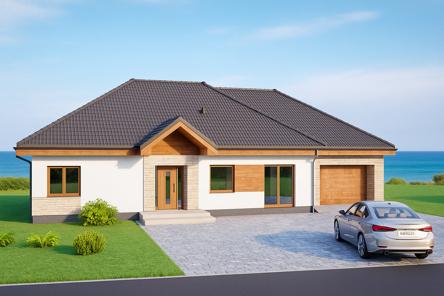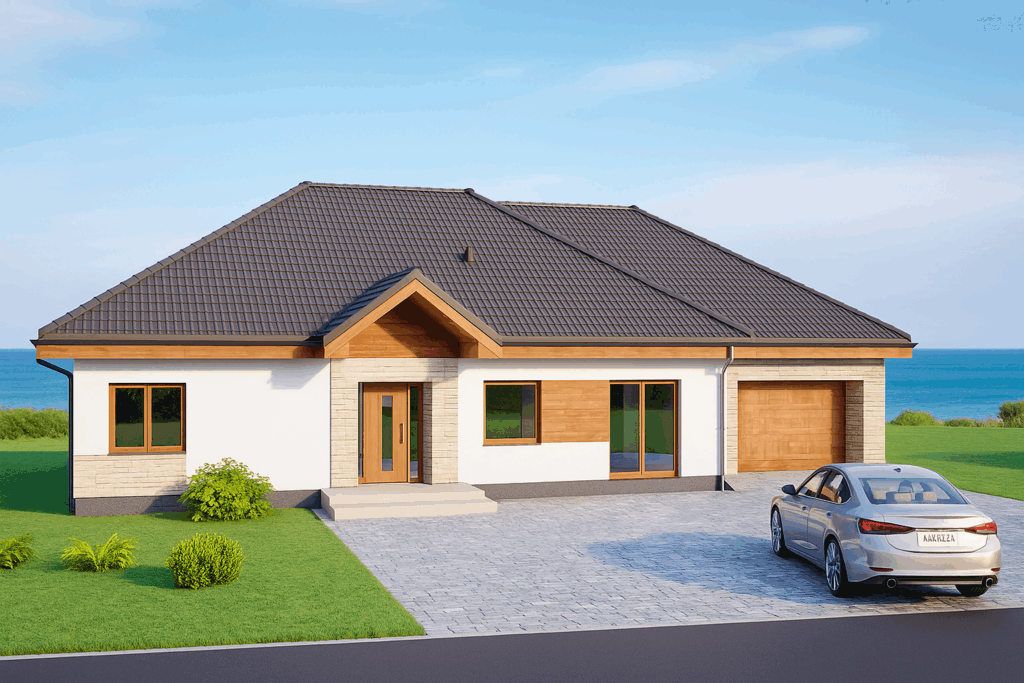 S pogledom na obalu, ova jednokatnica kombinira oštru bijelu žbuku s toplim drvenim detaljima i ručno položenim kamenim oblogama ispod tamnog krova obloženog crijepom. Veliki prozori i klizna staklena vrata preplavljuju unutrašnjost svjetlošću i otvaraju se na široku kamenu terasu koja obavija kuću. Ugodan trijem sa zabatom, integrirana pojedinačna garaža i široki prilaz osiguravaju svakodnevnu udobnost, dok zaštićena veranda s kamenim stupom poziva na objedovanje na otvorenom u svim godišnjim dobima. Prirodni materijali, energetski učinkovita konstrukcija i bezvremenske linije daju ovom bungalovu opušten, ali profinjen karakter.