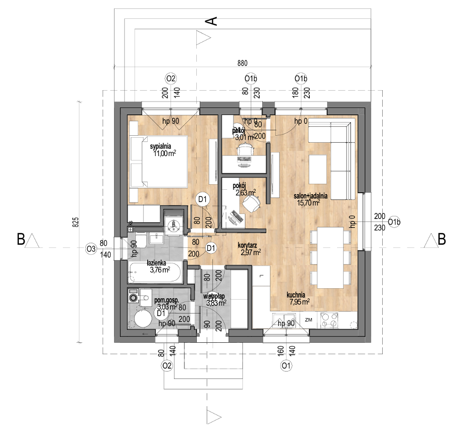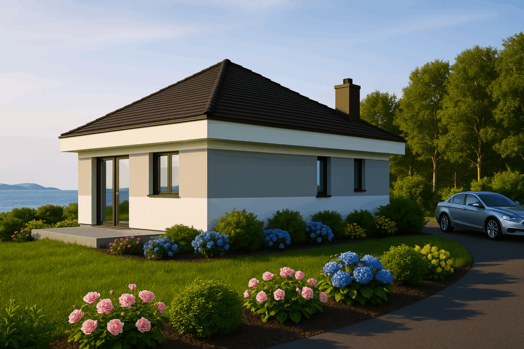 Oštra bijela fasada, antracit krovni crijep i crni aluminijski prozori stvaraju bezvremensku privlačnost rubnika, dok visoka izolacija i dvostruko staklo smanjuju račune za energiju.