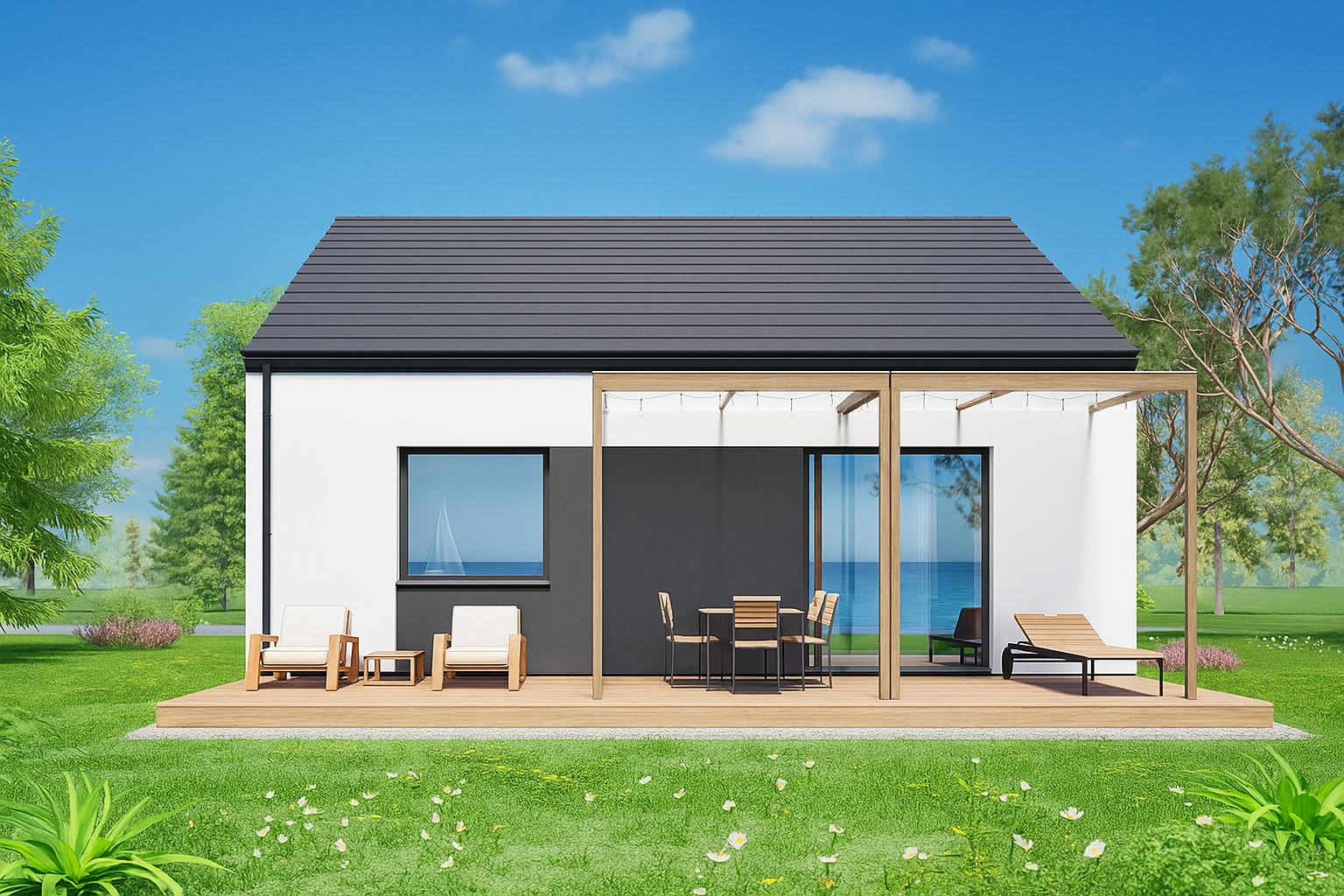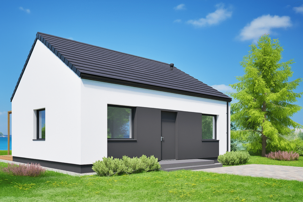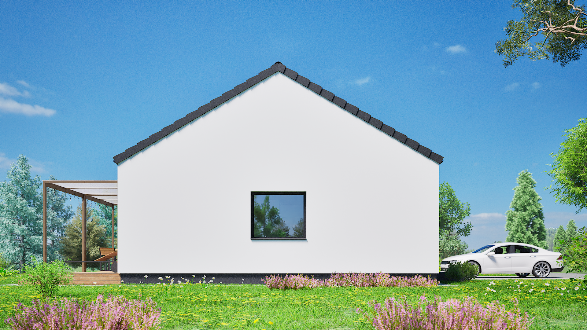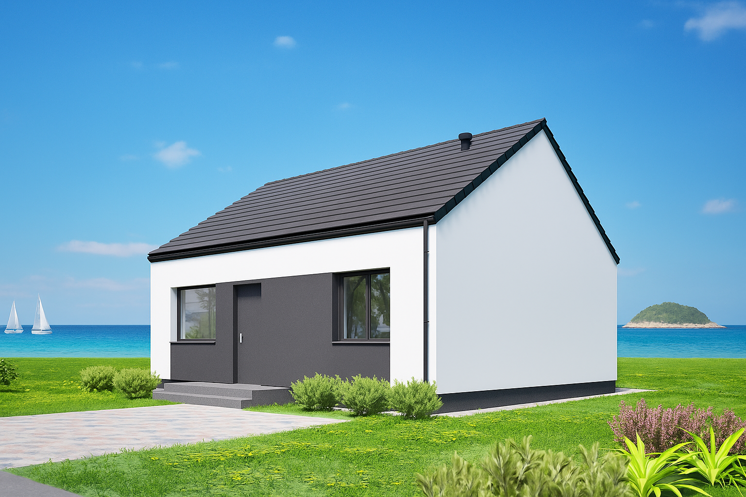 Ova kompaktna jednokatnica ima jednostavan pravokutni tlocrt prekriven klasičnim dvoslivnim krovom. Čista bijela žbuka u kontrastu je na jednom dugom uzvišenju s ugljen-sivom trakom koja uokviruje ulazna vrata i ulazne prozore, dajući fasadi oštar, suvremen izgled. Tanki crni profili prozora odjekuju tamnim crijepom, dok duboke strehe održavaju linije oštrima. Straga se velika klizna vrata otvaraju na drvenu terasu koja se proteže cijelom širinom kuće; Lagana pergola proteže se od zida tako da možete objedovati na otvorenom u pjegavoj hladovini. Unutra, dnevna zona otvorenog plana zauzima najsunčaniju stranu, a kompaktni otisak još uvijek sadrži dvije udobne spavaće sobe, potpuno opremljenu kupaonicu i pomoćnu nišu. Zahvaljujući skromnom rasponu i jednostavnim detaljima, ovaj dizajn je pristupačan za izgradnju i iznimno jednostavan za grijanje, ali i dalje nudi izdašne veze s vrtom i pogledom na jezero.