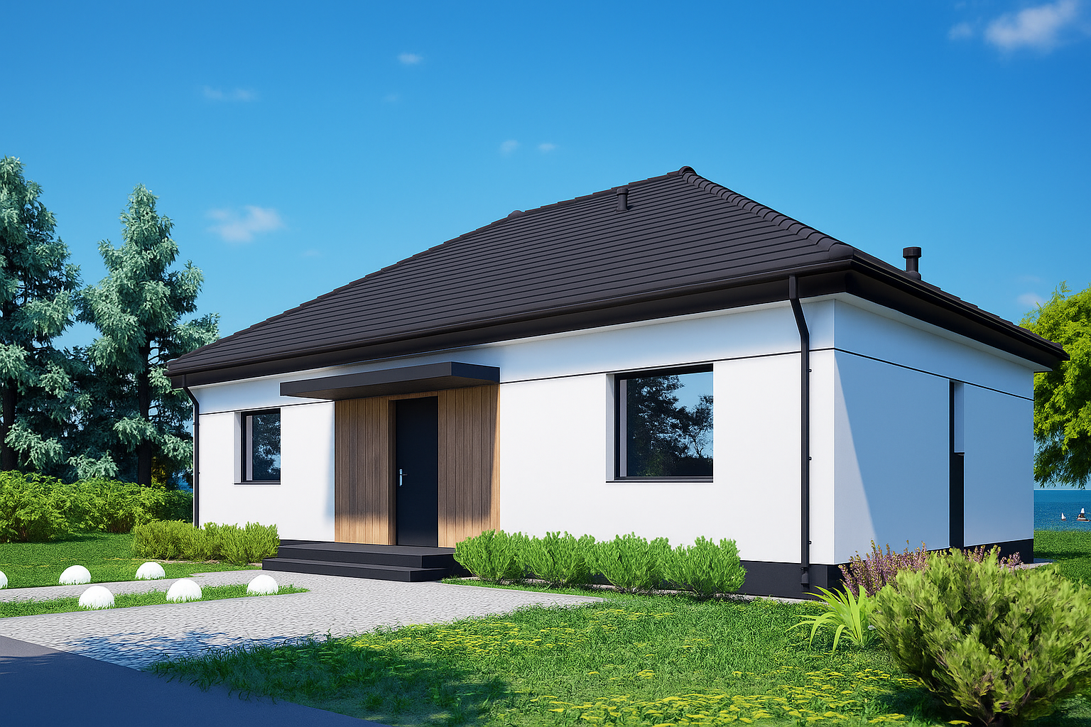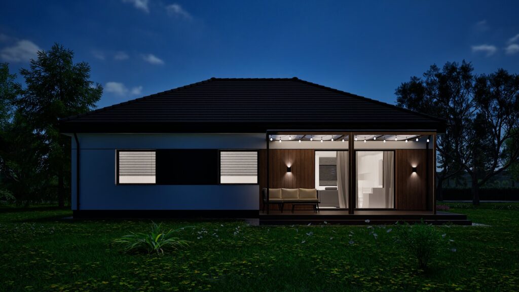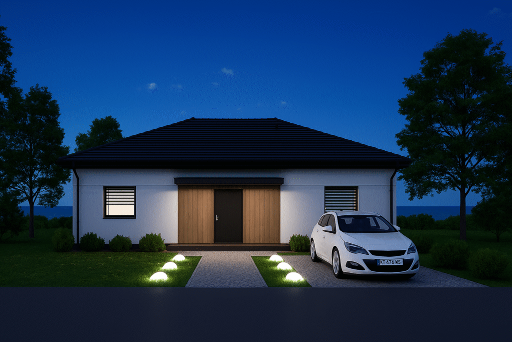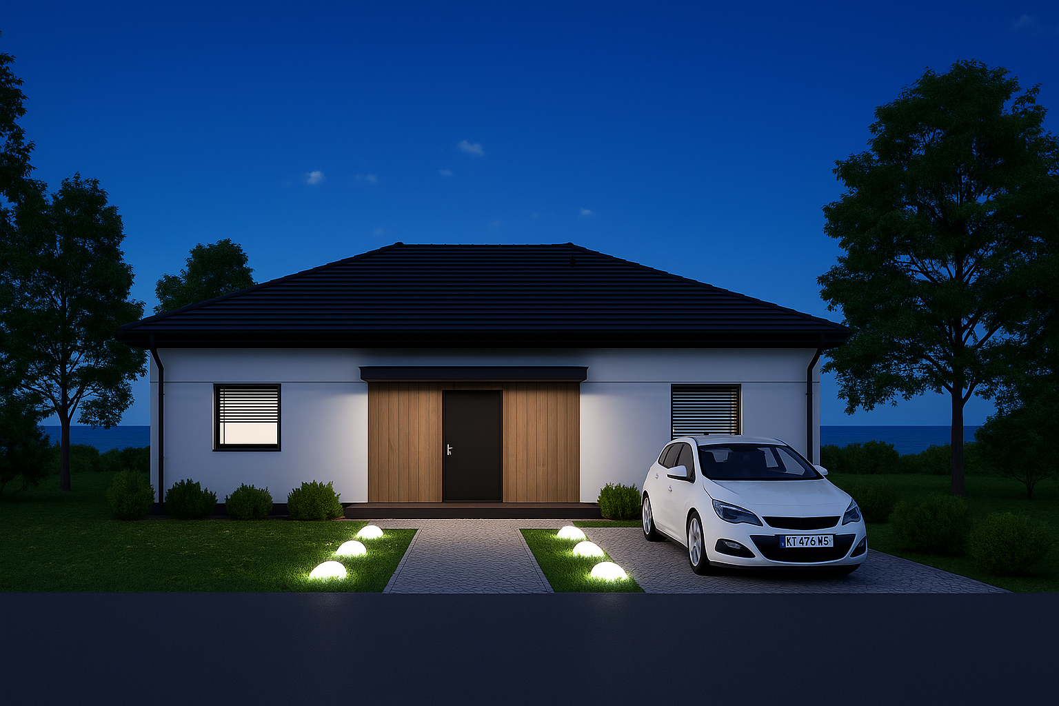 Ova jednokatnica kombinira oštru bijelu žbuku s toplom okomitom drvenom oblogom koja obavija ulaz i proteže se preko stražnjeg uzvišenja. Niski, tamnosivi četverovodni krov učvršćuje kompoziciju, dok tanki antracitni okviri prozora održavaju linije čistima i suvremenima. Noću nenametljiva kupolasta svjetla postavljena u travnjak ističu popločani prilaz i naglašavaju široka drvena ulazna vrata uvučena ispod minimalističke nadstrešnice. Straga je drvena paluba zaštićena laganom pergolom nanizanom žaruljama, stvarajući primamljiv vanjski dnevni boravak koji prirodno teče iz ostakljenih klizača glavnog životnog prostora.