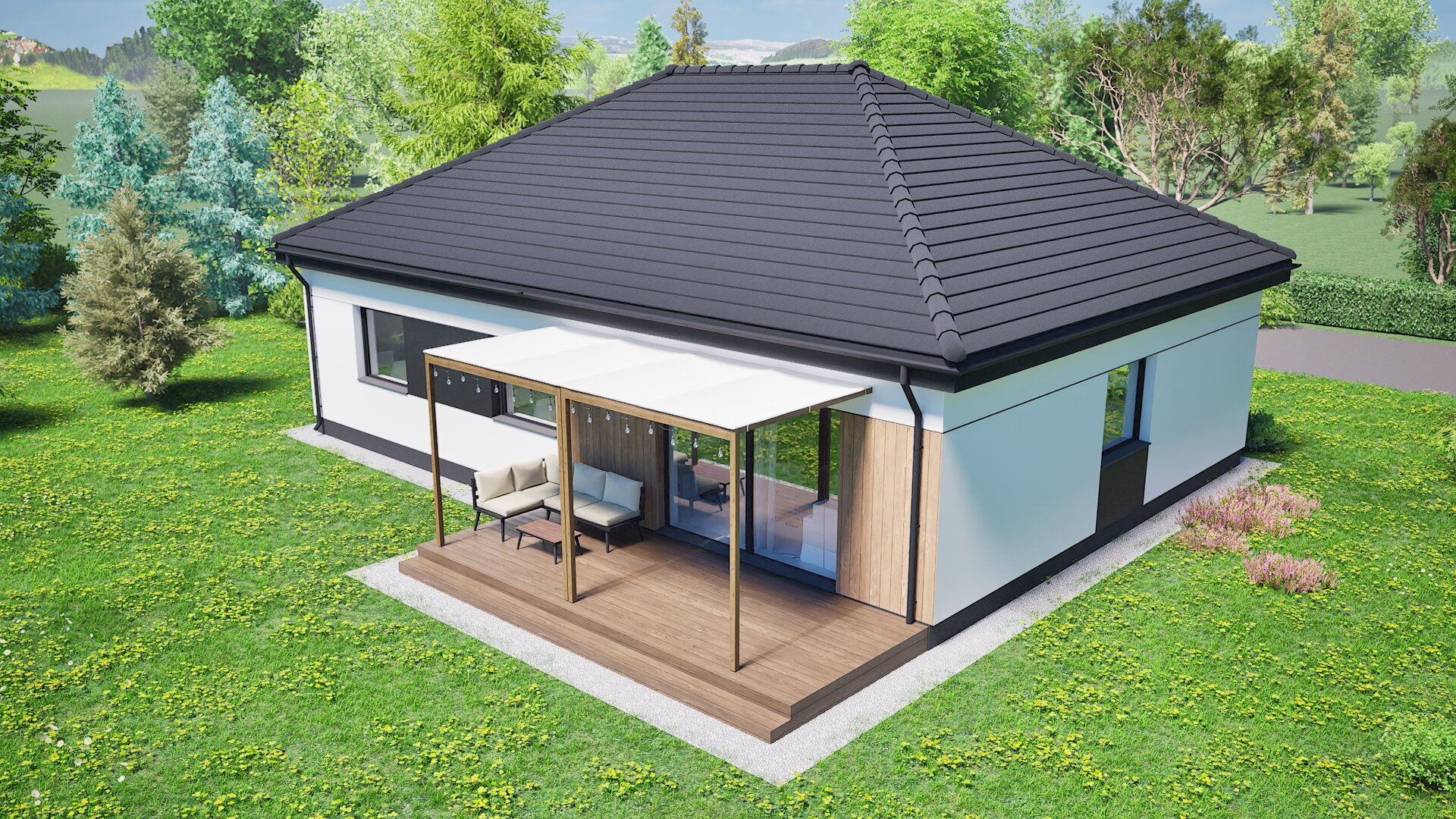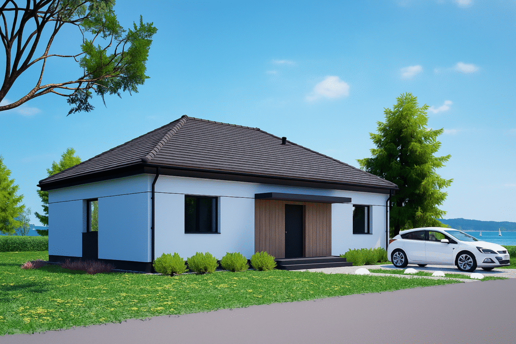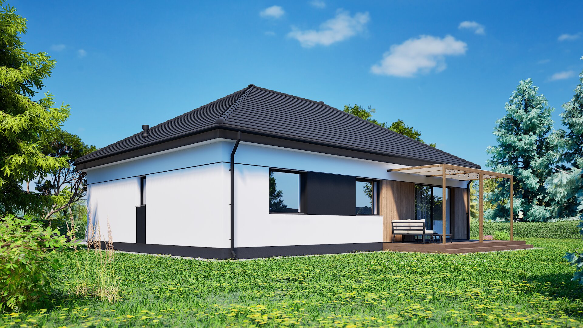 Ova jednokatnica kombinira oštru bijelu žbuku s toplom okomitom drvenom oblogom koja obavija ulaz i proteže se preko stražnjeg uzvišenja. Niski, tamnosivi četverovodni krov učvršćuje kompoziciju, dok tanki antracitni okviri prozora održavaju linije čistima i suvremenima. Noću nenametljiva kupolasta svjetla postavljena u travnjak ističu popločani prilaz i naglašavaju široka drvena ulazna vrata uvučena ispod minimalističke nadstrešnice. Straga je drvena paluba zaštićena laganom pergolom nanizanom žaruljama, stvarajući primamljiv vanjski dnevni boravak koji prirodno teče iz ostakljenih klizača glavnog životnog prostora.