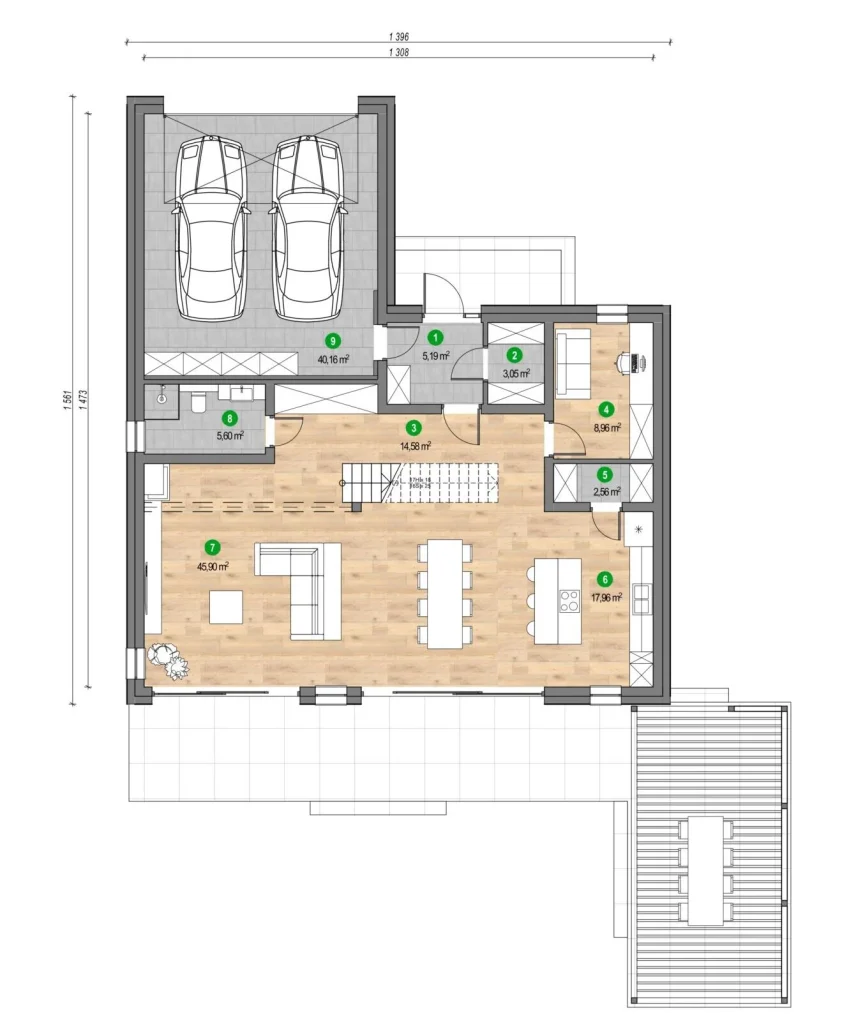 • Dnevni boravak + blagovaonica: 45,90 m2