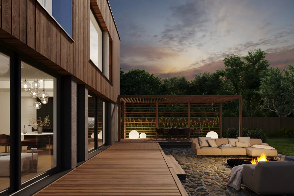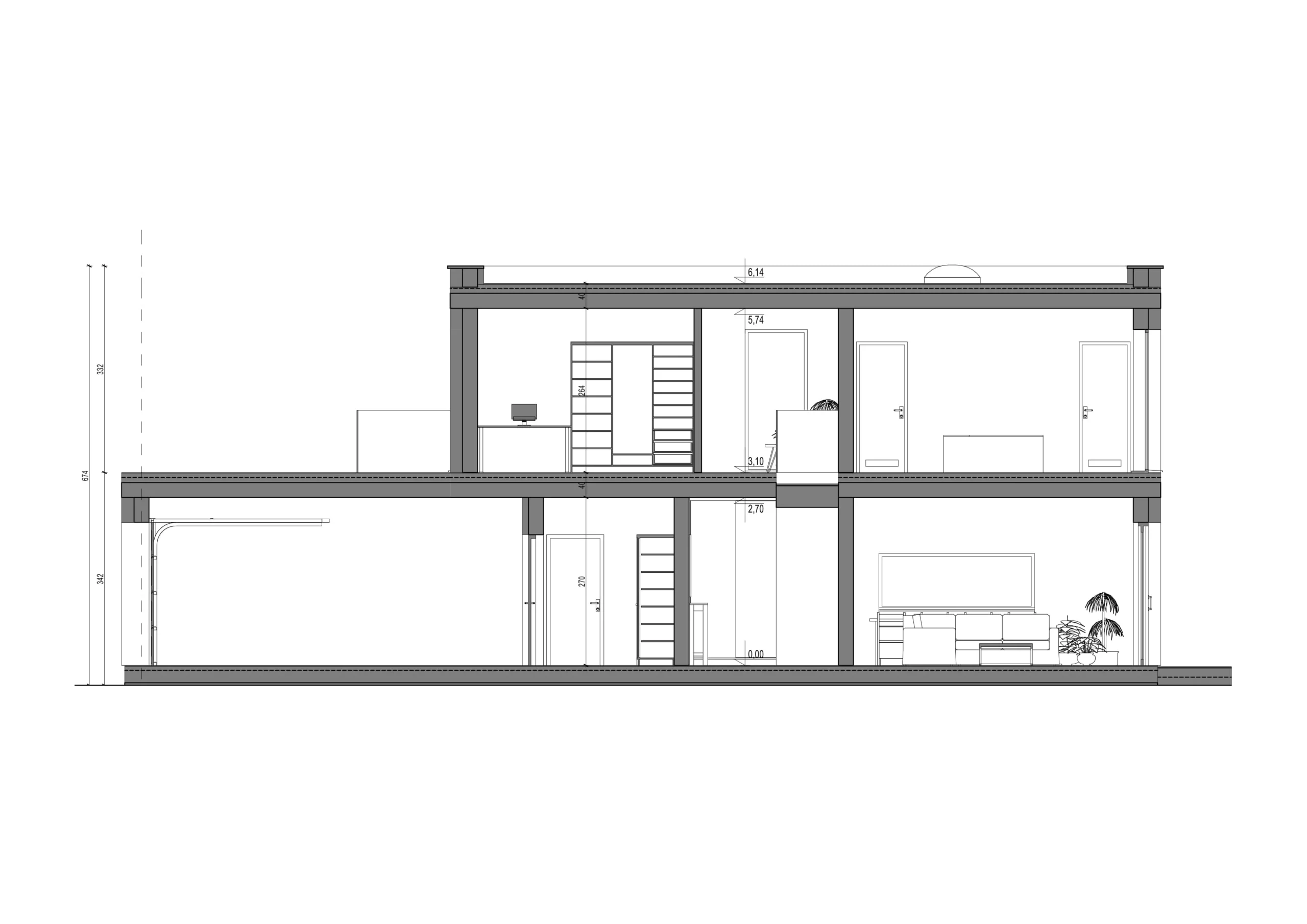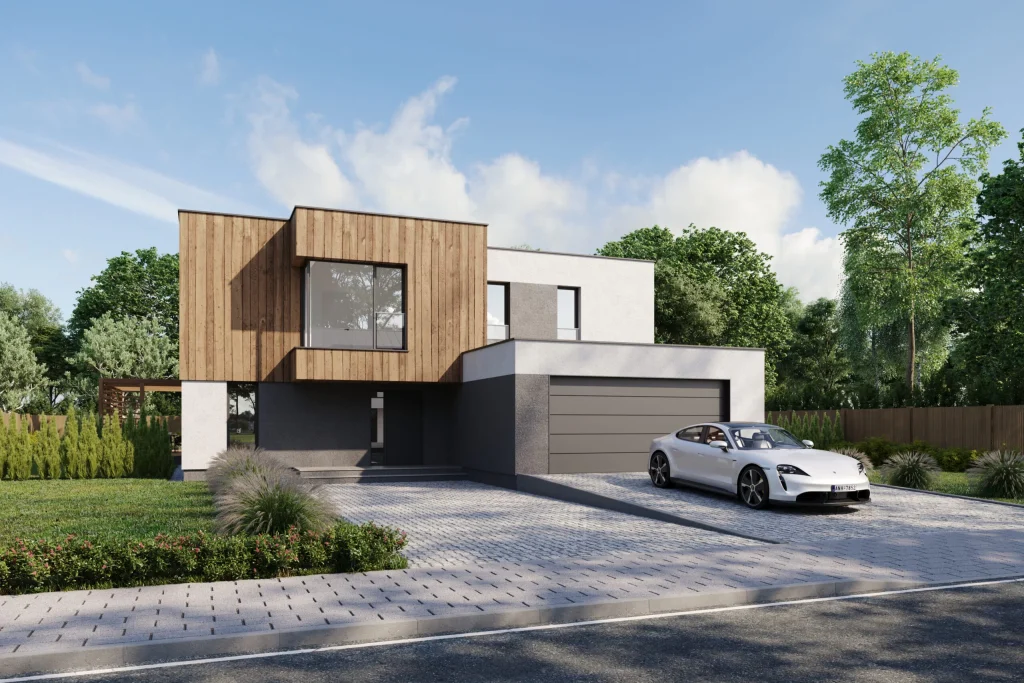 Kuću odlikuje moderna karoserija s ravnim krovom, velikim ostakljenim prozorima i terasnim vratima te staklenim ogradama. Zanimljiv dodatak konceptu je izgradnja pergole preko dijela terase. Kuhinja, velika blagovaonica i dnevni boravak stvaraju otvoren, svjetlom ispunjen prostor. Osjećaj prostora dodaje praznina iznad blagovaonice, uz stubište koje vodi na gornji kat. Blagovaonica tako čini središte cijele kuće. Prikladno za spavaće sobe nalazi se zasebna kupaonica, neovisna garderoba i izlaz na balkon. Osim spavaće sobe, na katu se nalaze i tri prostrane sobe koje pružaju širok raspon mogućnosti uređenja.
