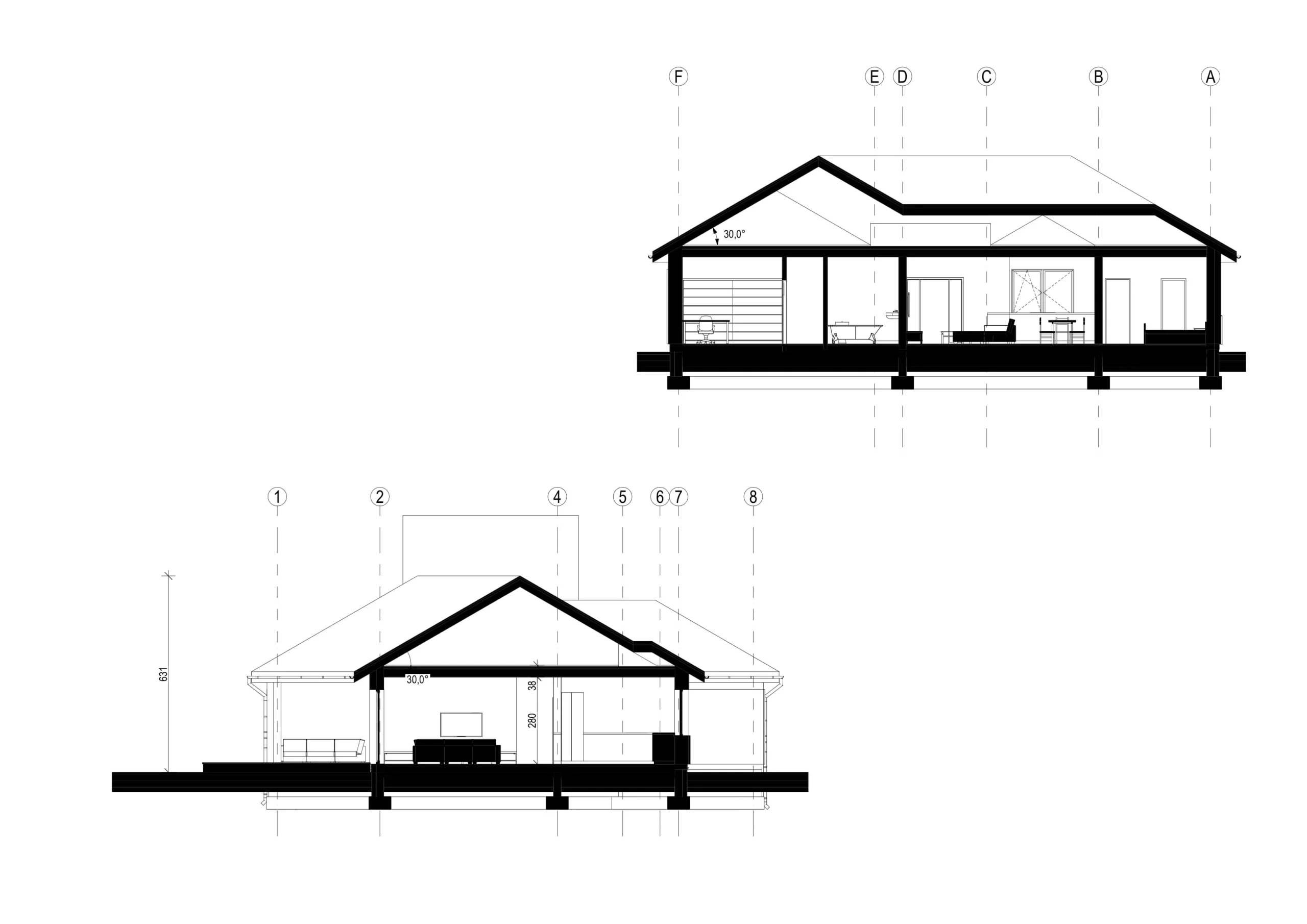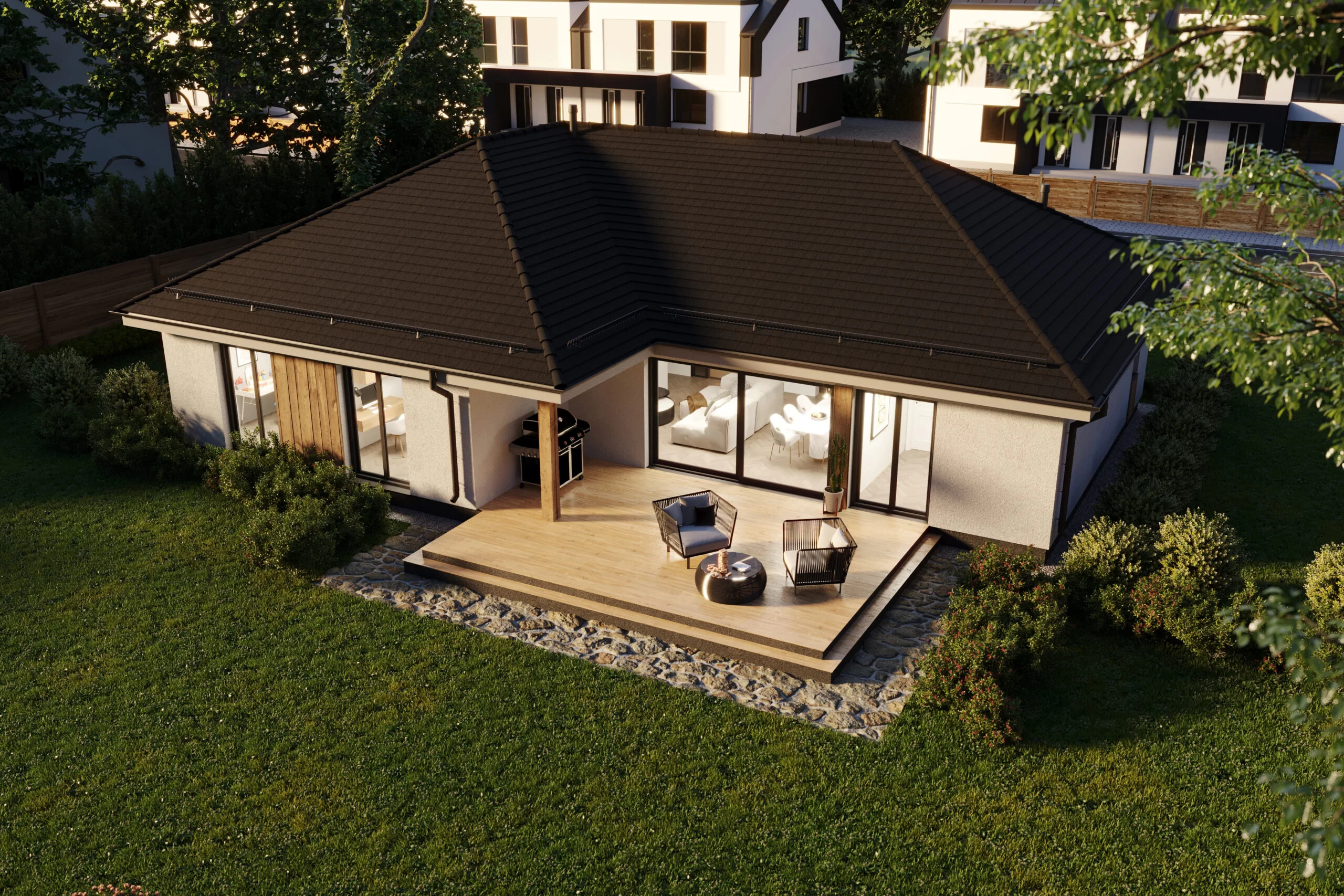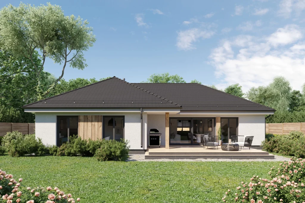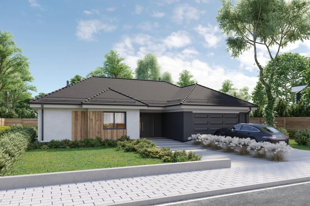 Jednokatnica kombinira tradicionalno tijelo – višeslojni krov i moderne završne obrade – prirodno drvo korišteno na fasadi, grafitne pločice i detalje. Kuća ima veliku, djelomično natkrivenu terasu s jugozapadnom ekspozicijom. Ova strana ima i najveće ostakljenje, otvarajući dnevni boravak i spavaću sobu prema vrtnom prostoru. Kuća je podijeljena na funkcionalne zone – u središnjem dijelu nalazi se dnevni boravak s otvorenom kuhinjom, s jedne strane je spavaća soba s odvojenom garderobom i kupaonicom, s druge strane su ostale prostorije. Dodatni prostor za odlaganje osigurava neiskorišteno potkrovlje – potkrovlje, kojem se pristupa kroz ulaz koji se nalazi u garaži.
