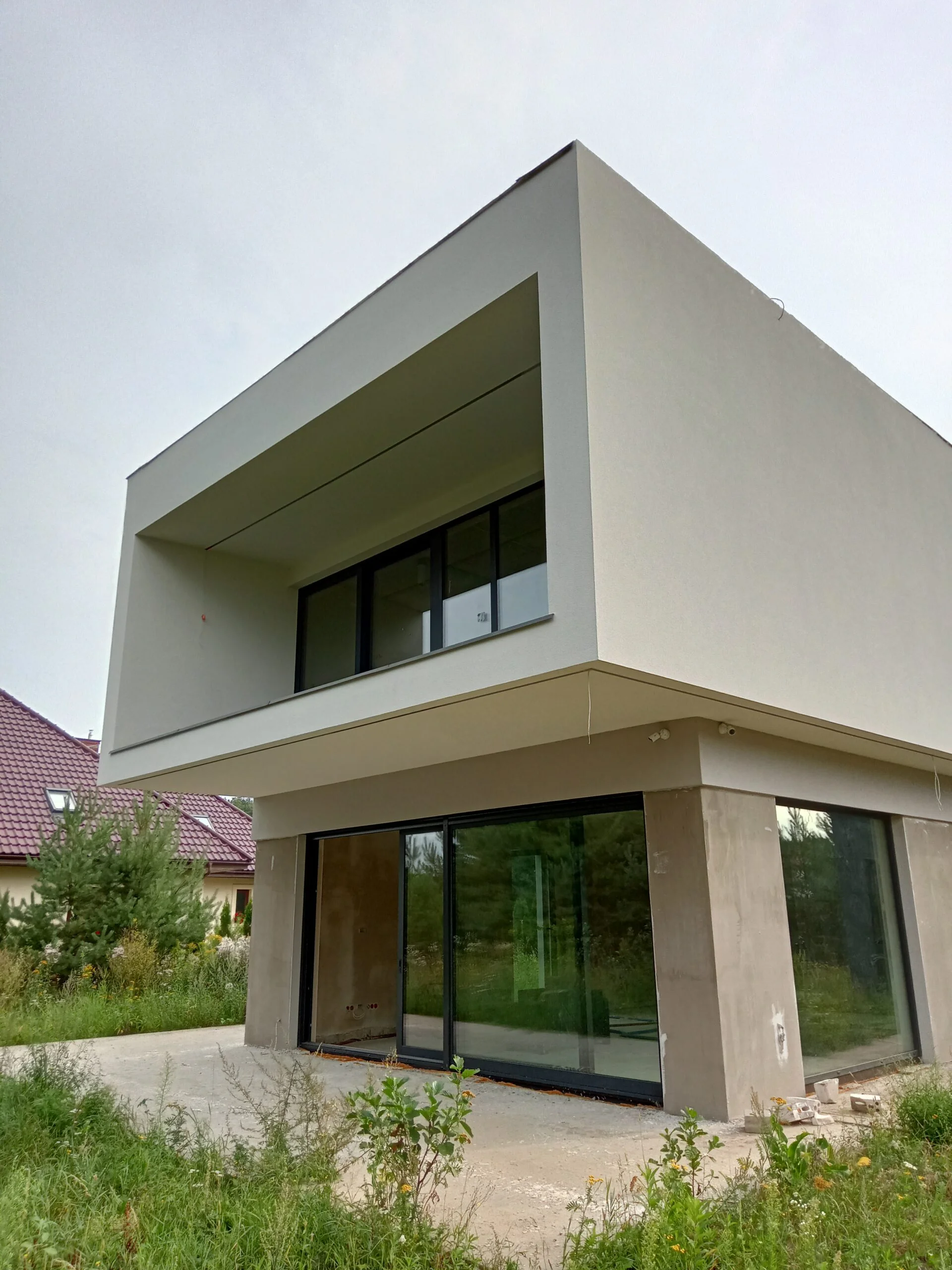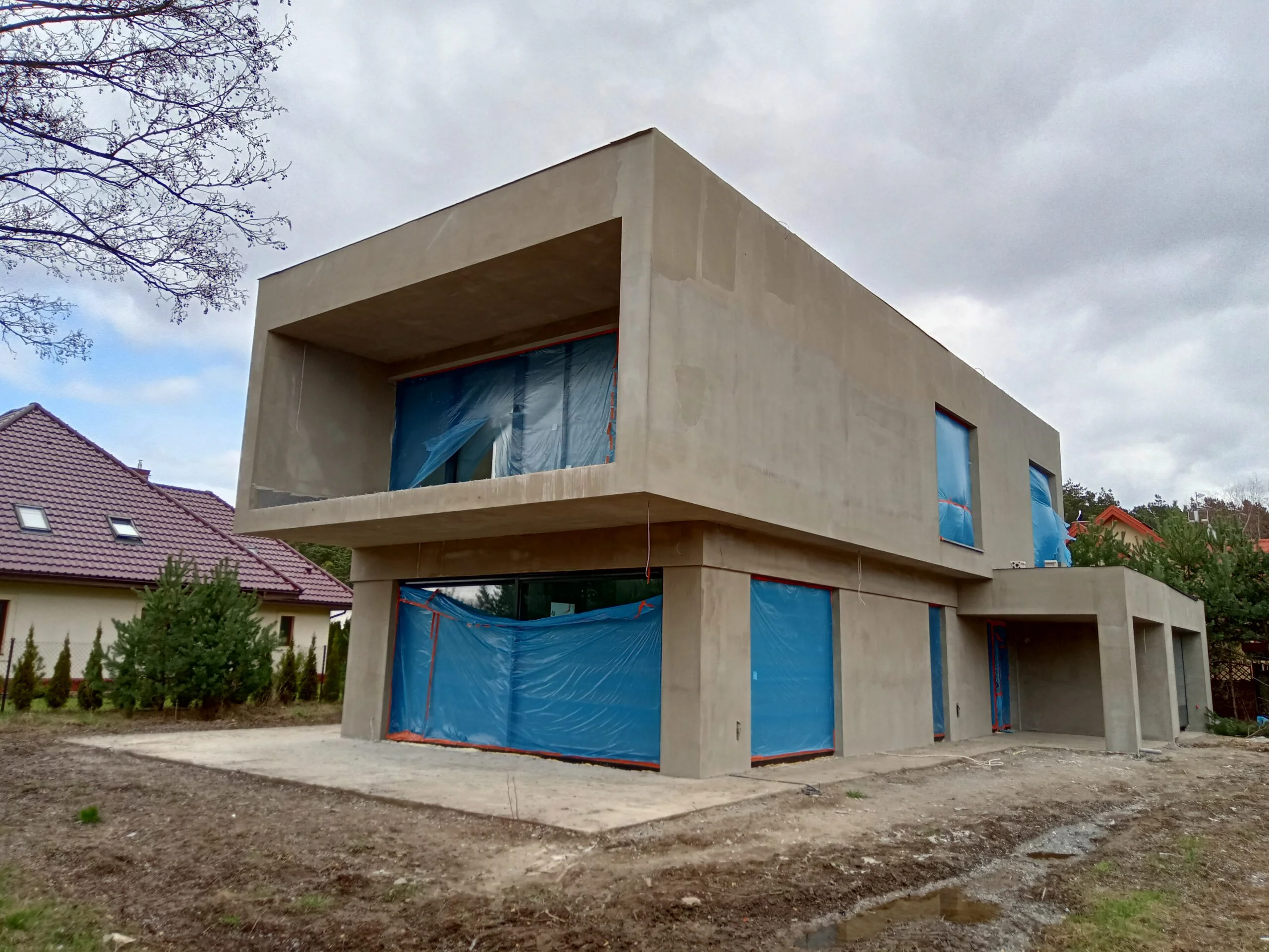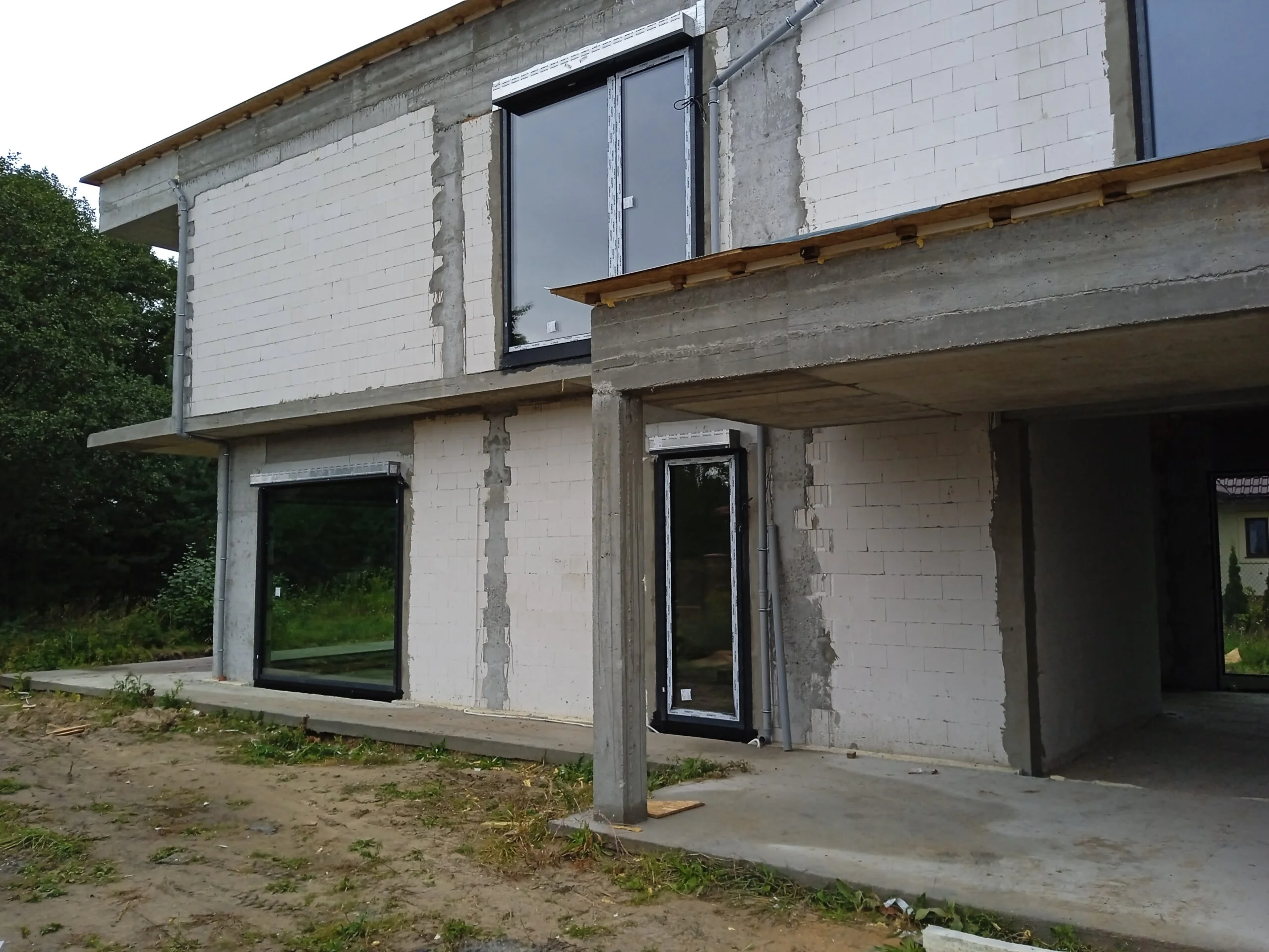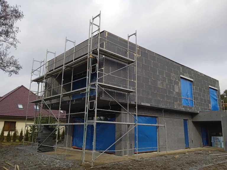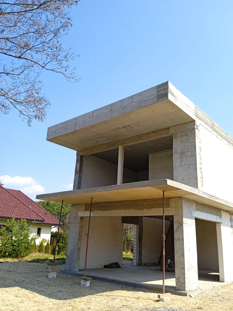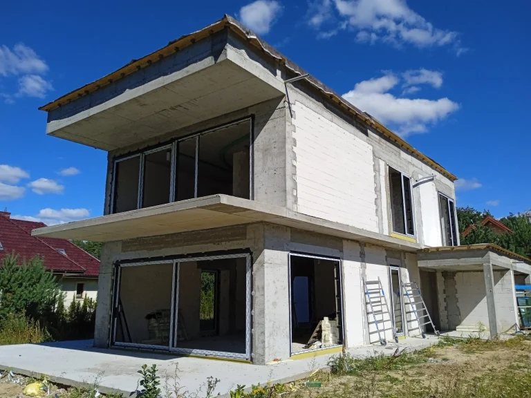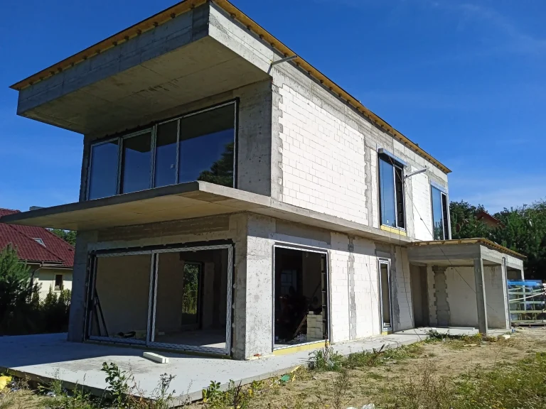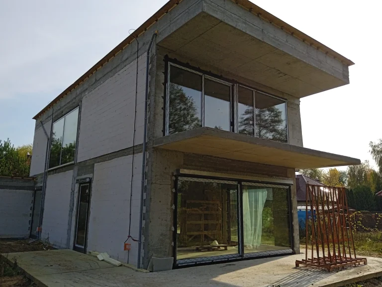 Kuća površine 221 m2 izgrađena je na armiranoj temeljnoj ploči s toplinskom izolacijom debljine 15 cm. Nosivi i pregradni zidovi izrađeni su od silikatnih blokova debljine 25 cm, odnosno 12 cm. Strop je monolitni. Krov zgrade je ravan.