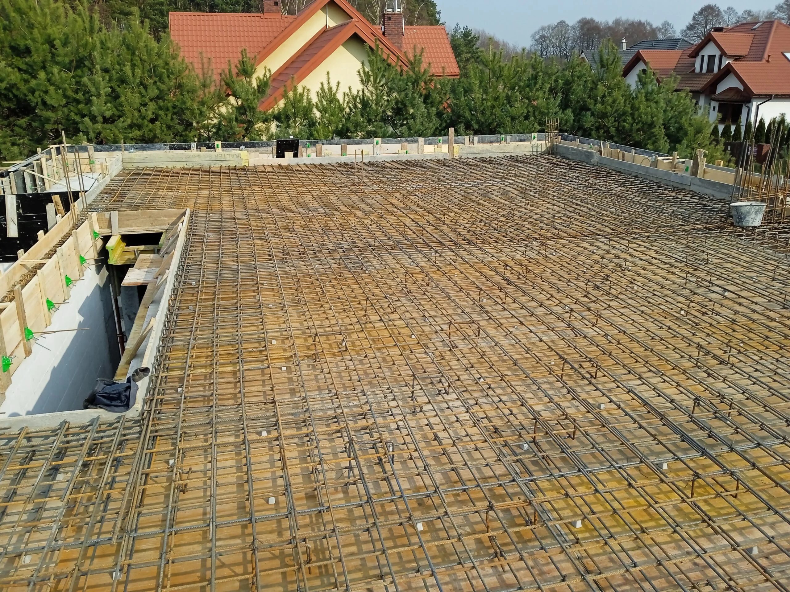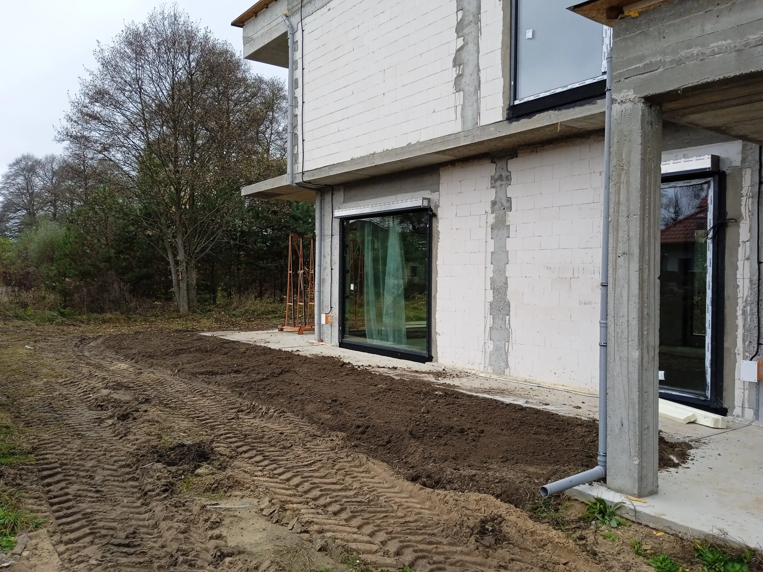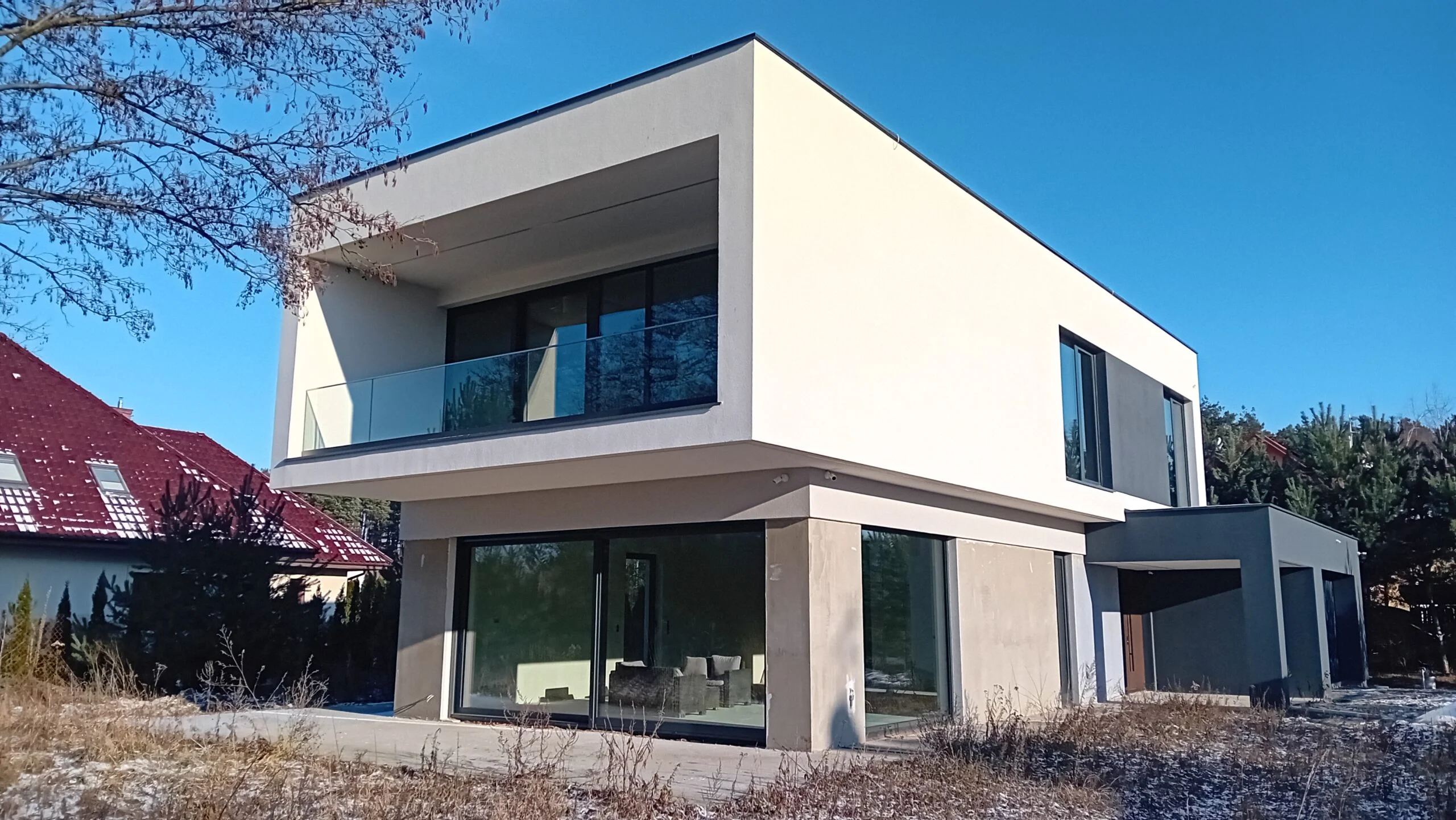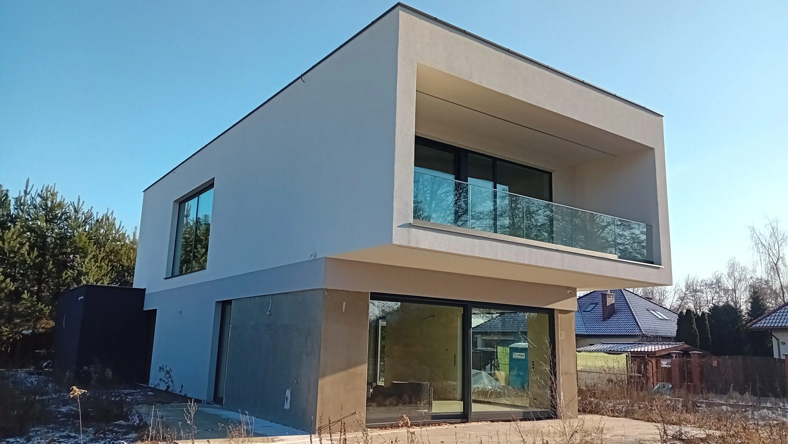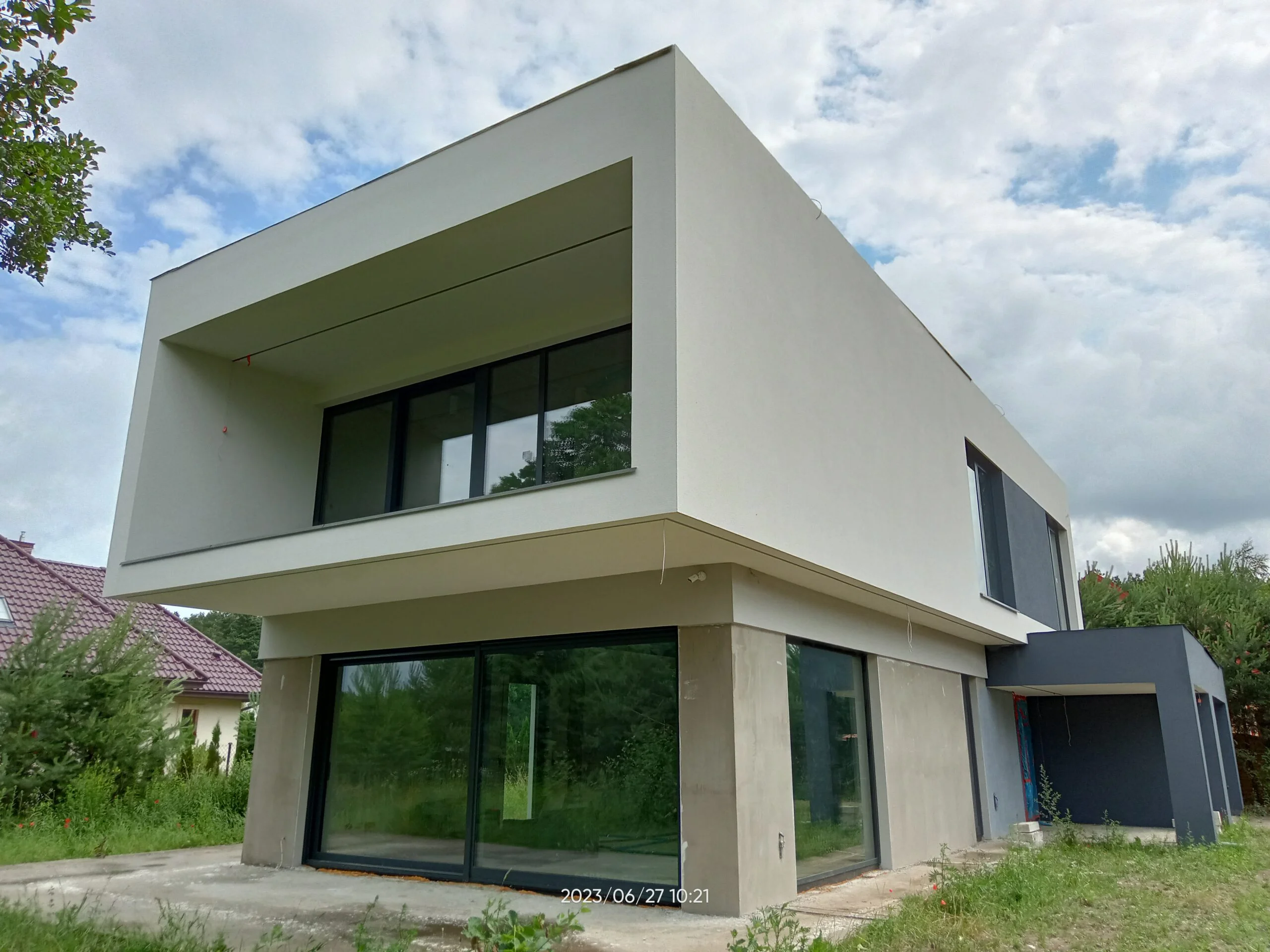 Kuća površine 221 m2 izgrađena je na armiranoj temeljnoj ploči s toplinskom izolacijom debljine 15 cm. Nosivi i pregradni zidovi izrađeni su od silikatnih blokova debljine 25 cm, odnosno 12 cm. Strop je monolitni. Krov zgrade je ravan.